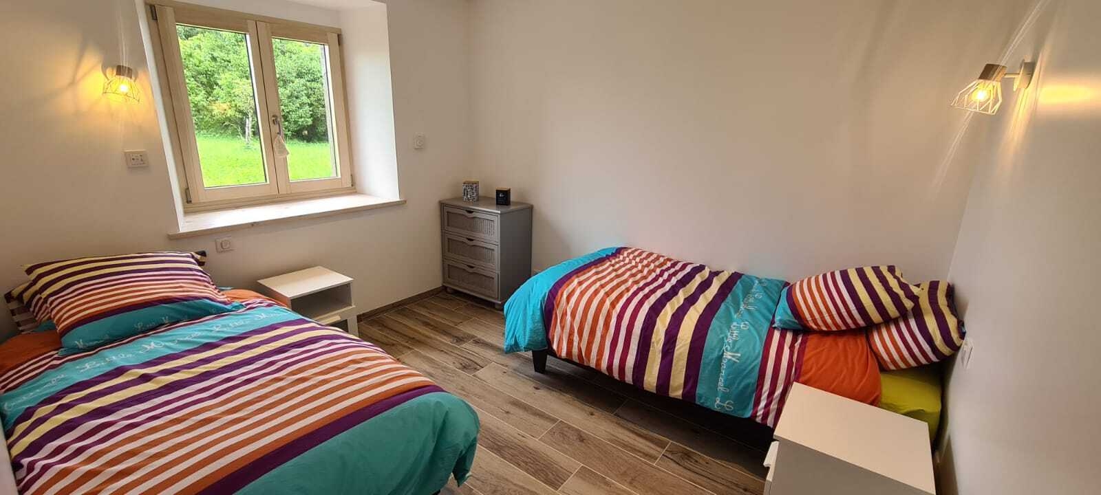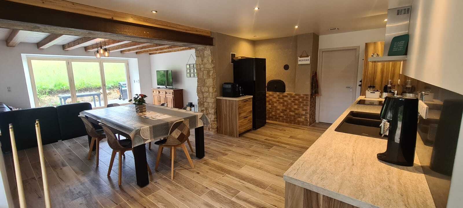 Envie de calme et de nature? alors ce gîte est fait pour vous! Ancienne ferme du Haut-Jura de 1852 entièrement rénovée par son propriétaire, cette maison indépendante de plain-pied se compose d'une pièce de vie avec cuisine intégrée toute équipée, d'un salon avec TV et table transformable en billard, de 2 chambres avec chacune un lit en 160, d'une chambre avec 2 lits simples, d'une salle d'eau avec douche à l'italienne et d'un WC indépendant. Côté extérieur : salon de jardin, barbecue, terrain de pétanque et piscine commune (ouverte de début mai à fin octobre, dimension 10m-4m, profondeur 1m40) vous permettront de profiter de la quiétude des lieux. Pour votre plus grand confort, les lits seront faits à votre arrivée. Idéalement situé, l'hiver pour les pistes de ski de fond et raquettes et l'été pour la randonnée, vous pourrez également vous rendre en une trentaine de minutes dans la région des lacs pour vous baigner au lac de Chalain,ou visiter le site des cascades du Hérisson. Les petit plus : enceinte JBL et volets roulants électriques dans chaque pièce. Un seul animal accepté qui ne sera pas laissés dans le gîte en l'absence de ses maîtres. Terrain de pétanque partagé. Borne de recharge électrique (11kwh) à disposition sur place.