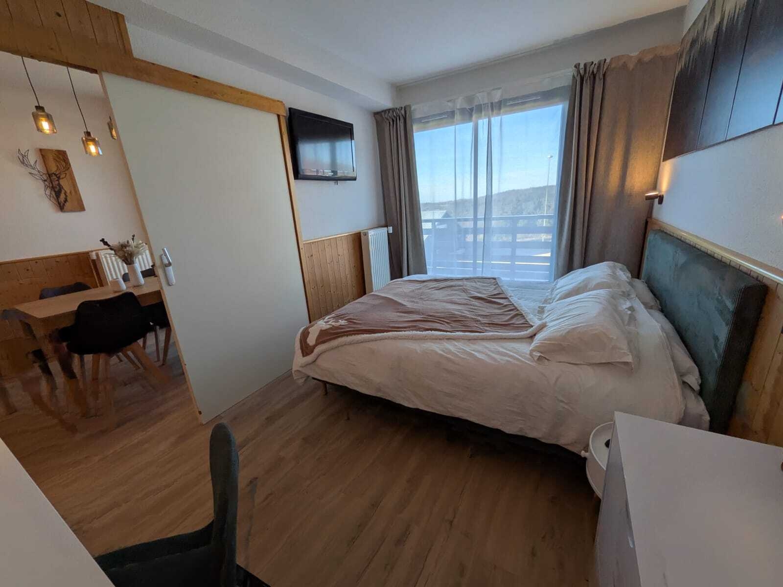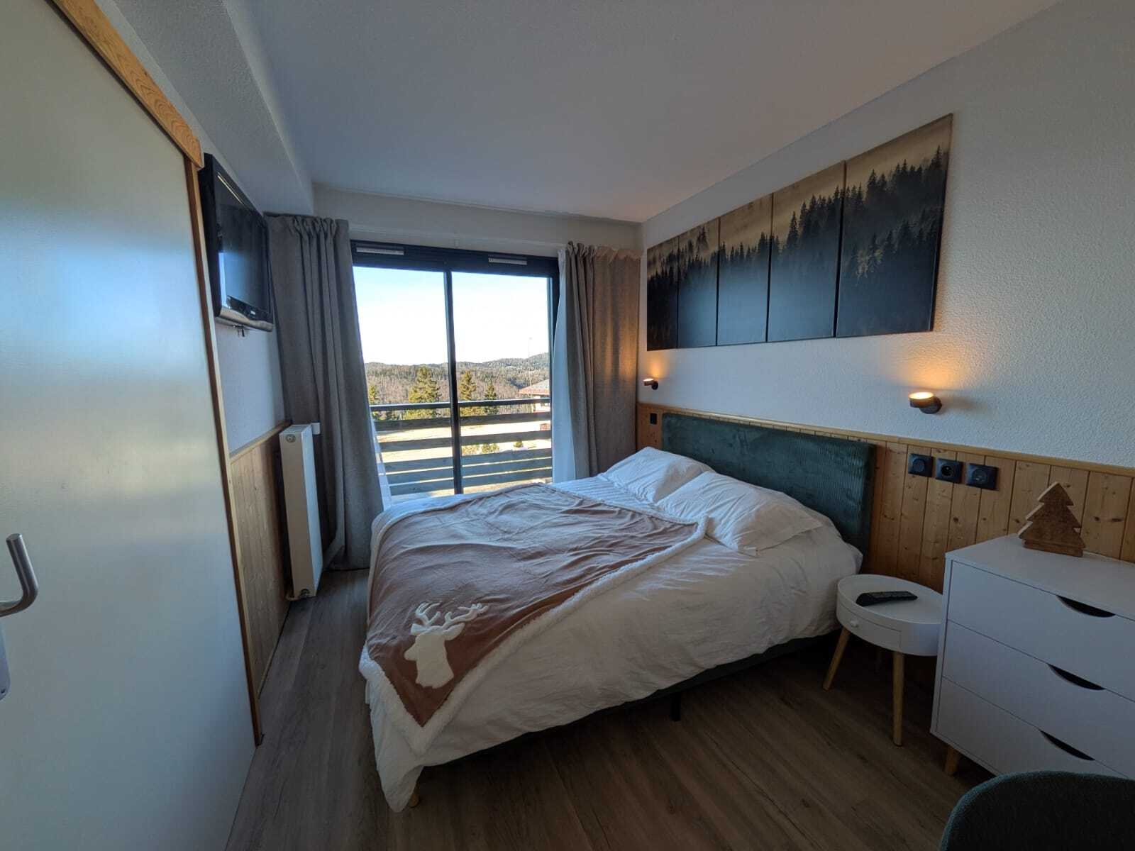 La chambre principale lumineuse offre balcon et vue sur les montagnes du Jura tandis qu’une seconde chambre indépendante accueille enfants ou amis.