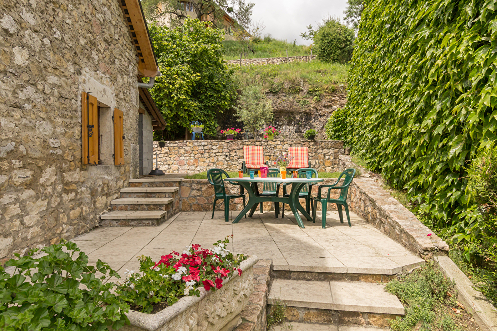 Accès au gîte, par quelques marches extérieures, qui mènent sur un coin cuisine ouvert sur séjour, où la chaleur du bois vous promet d'agréables soirées en famille ou entre amis (bois gratuit). Une chambre (1 lit 2 personnes), salle de bain, WC indépendant. Au 1er, mezzanine semi-ouverte (2 lits 1 personne et 1 lit bébé). Vous profiterez pleinement de la terrasse et de la petite pelouse avec belle vue sur la montagne environnante (Dent du Chat, le Colombier). A proximité de Champagne en Valromey, un endroit privilégié pour de belles randonnées, et profiter des saveurs du terroir. Via Rhôna à 12 km. - Sommet Grand Colombier : 14 km - Culoz : 10 km - Genève : 75 km - Lyon : 100 km