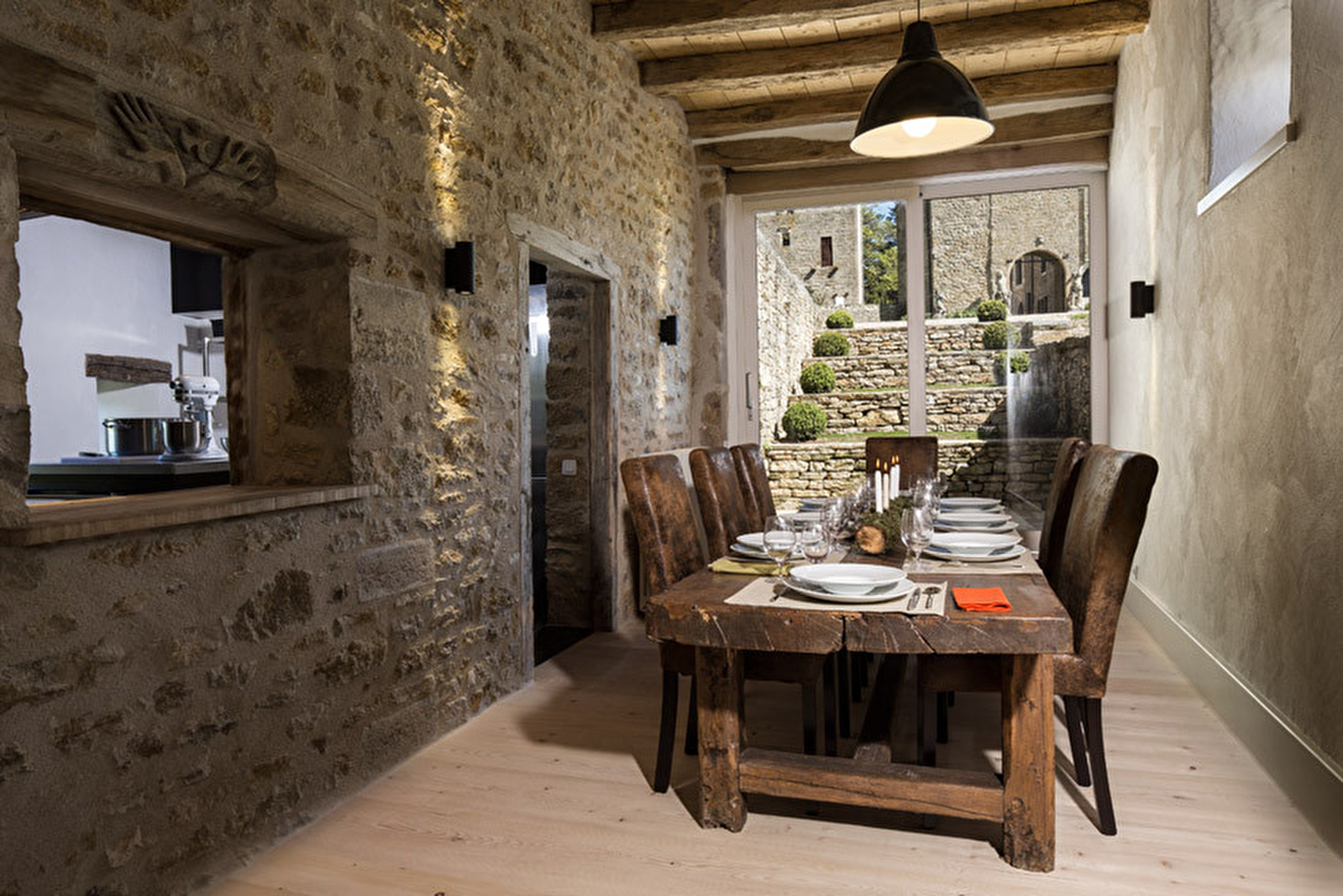 Le gite de LA FERME est le plus spacieux des 3 gites du château, pouvant accueillir 9 personnes. Au rez de chaussée, le grand salon avec feu ouvert comprend également un espace bar. De l'autre côté, la cuisine équipée (dont cuisinière vitrocéramique) donne sur une grande salle à manger et une terrasse avec vue sur le château. Au 1er étage vous disposez de 9 lits répartis sur 3 chambres avec douche et wc privatifs, (4+3+2 personnes) ainsi que d'un petit salon TV. Vous avez accès à l'ensemble du domaine : le parc, la piscine commune (en été), le terrain de tennis (multisport : mini-foot et volley), la terrasse dans la cour du château, le potager, l'étang de pêche. Des vélos sont à votre disposition : 6 VTT et 2 vélos électriques dès le printemps 2025 (sous caution). Le linge de maison (draps de lit et serviette de toilette), ainsi que le ménage de fin de séjour sont inclus dans le prix. Profitez en famille ou entre amis de ce magnifique Domaine du Chateau de Marigna, apprécié pour son calme, son charme et son confort.
