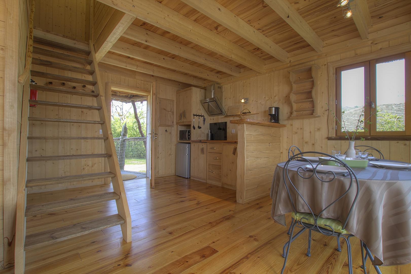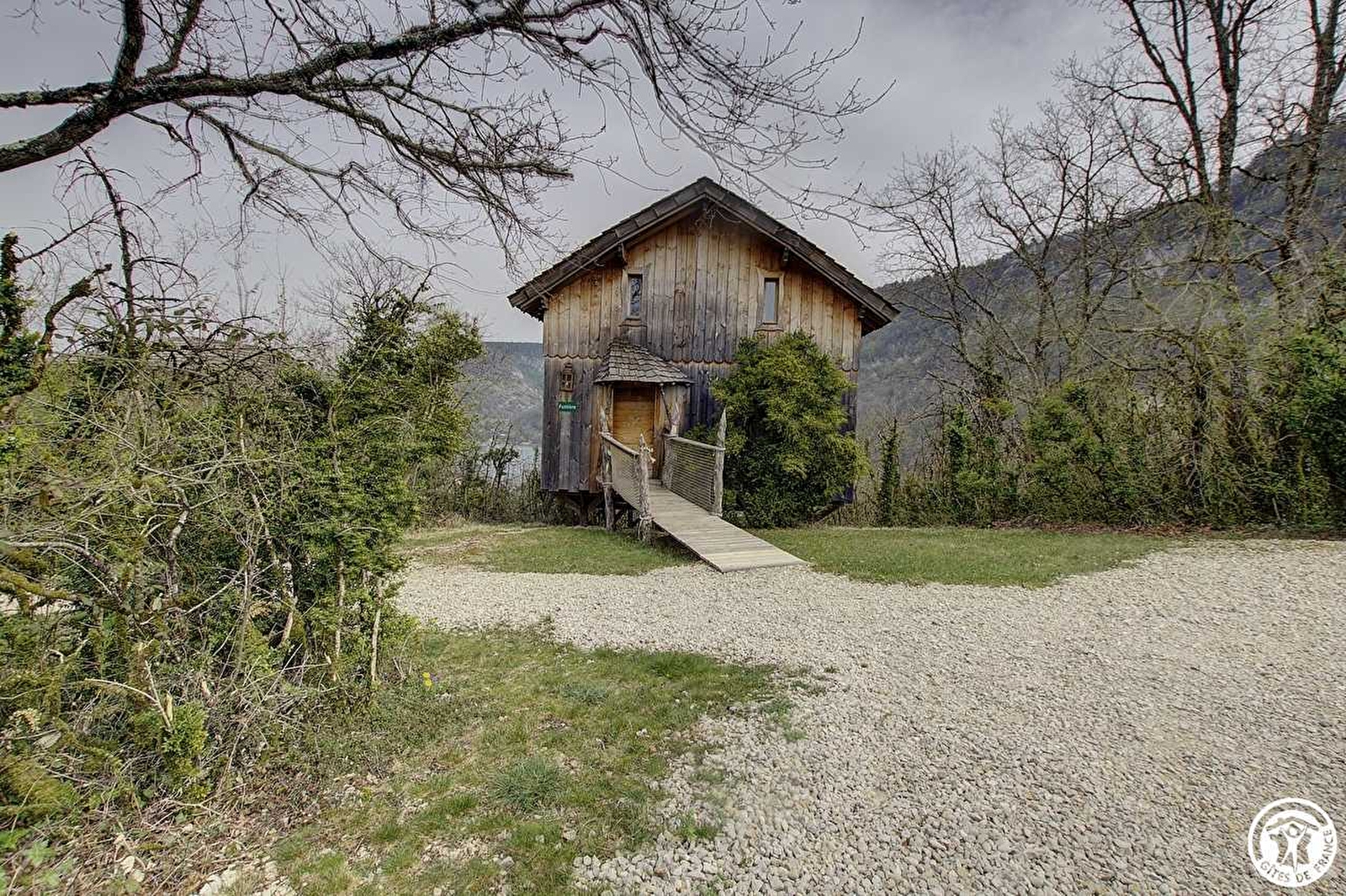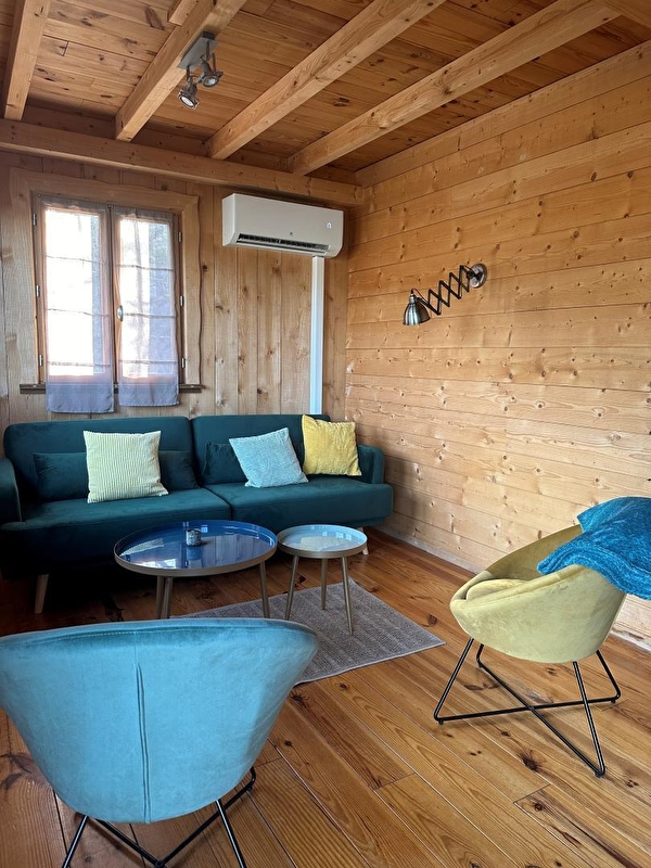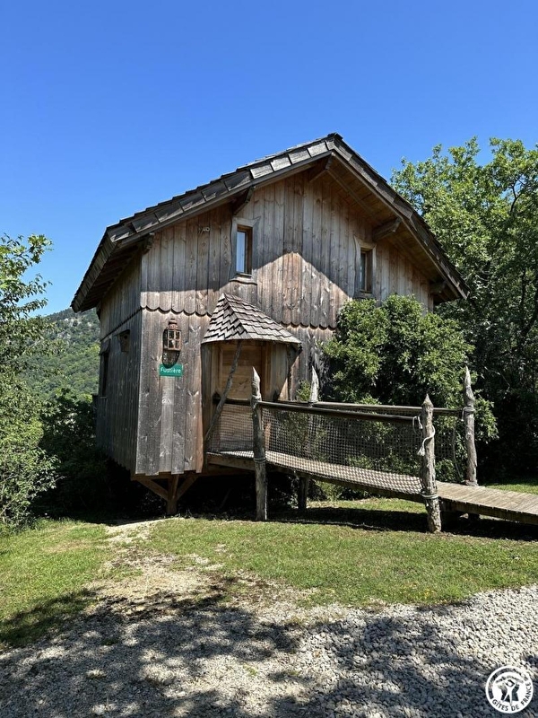 On ouvre la porte et à l'intérieur, l'espace, le confort, la vue plongeante sur la rivière d'Ain, sur ambiance bois, font de cette lodge un lieu unique. La pièce de vie de 25m² est composée de 3 espaces distincts. Dans le prolongement de l'entrée, la cuisine avec tout le confort (2 plaques vitrocéramiques, petit frigo avec congélateur et micro-ondes) se termine par un "bar américain" qui fait office de séparation avec l'espace repas. Le salon avec ses canapés club invite au prélassement. Cette pièce se prolonge par ses doubles baies vitrées sur la terrasse de 21 m² orientée soleil levant. Aux beaux jours, la terrasse est inondée de soleil jusqu'à 14h00. Elle offre une des plus belles vues panoramiques du site visible aussi bien à l'intérieur qu'à l'extérieur. Sur la terrasse, transats, tables et fauteuils à disposition. A l'étage, 2 chambres privatives, chacune baignée de luminosité avec ses baies vitrées côté rivière d'Ain et ses petites fenêtres côtés entrée principale. Une chambre se compose de 3 lits 90. L'autre chambre, spacieuse, a un lit de lutins, "taillé sur mesure" en 150*190 avec ses montants en forme de cône et son armoire. La salle d'eau se situe à l'entrée de la lodge. La Fustière fait partie d'un site " nature " comprenant au total 7 cabanes et lodges complètement intégrées dans cette forêt de buis, nichées sur les hauteurs de Serrières sur Ain, en aplomb de la rivière d'Ain. Site d'exception dans les gorges de l'Ain, permettant la pratique du canoë, aviron ou simplement baignade. Idéal pour la randonnée sur place ou pour profiter de l'île Chambod.