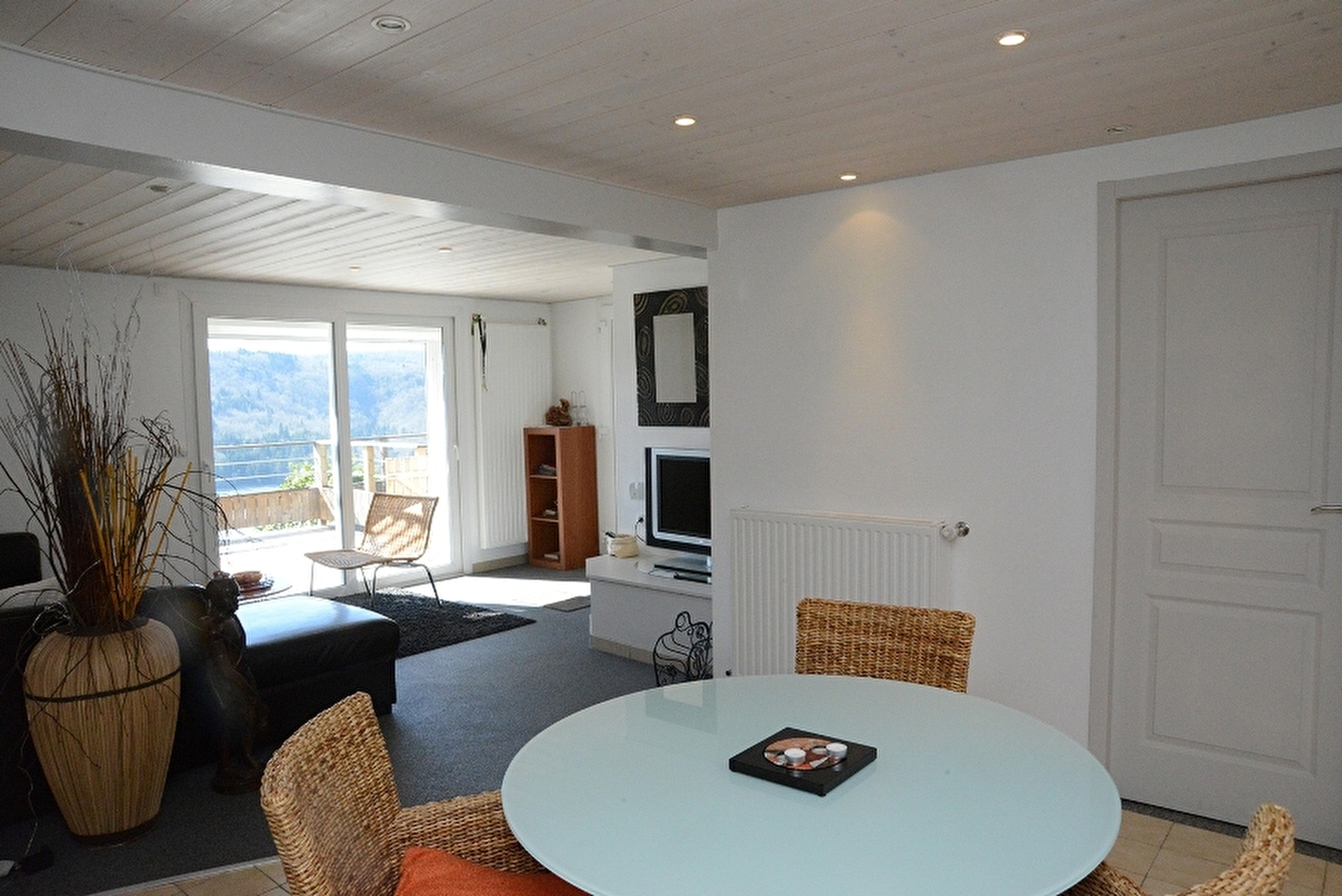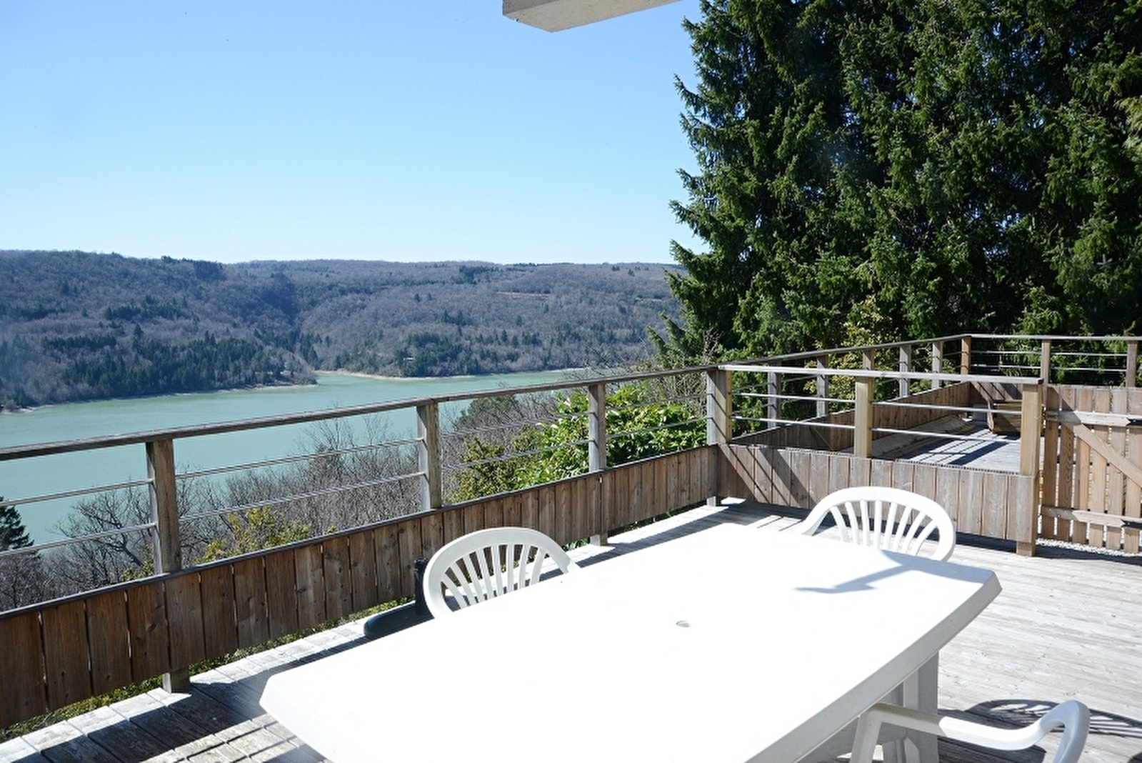 Logement indépendant au RDC entièrement rénové, mitoyen avec un autre gîte. Splendide vue sur le lac de Vouglans. Salon avec canapé convertible (1 couchage supplémentaire possible) salle à manger avec belle cuisine intégrée toute équipée, 1 chambre avec 1 lit 2 pl, sdb avec douche, Wc indépendant. Vous pourrez profiter de la vue imprenable sur le lac directement depuis la terrasse de 28 m². Salon de jardin, barbecue et local en commun pour le lave-linge avec le gîte de l'étage. Bois fourni gratuitement.