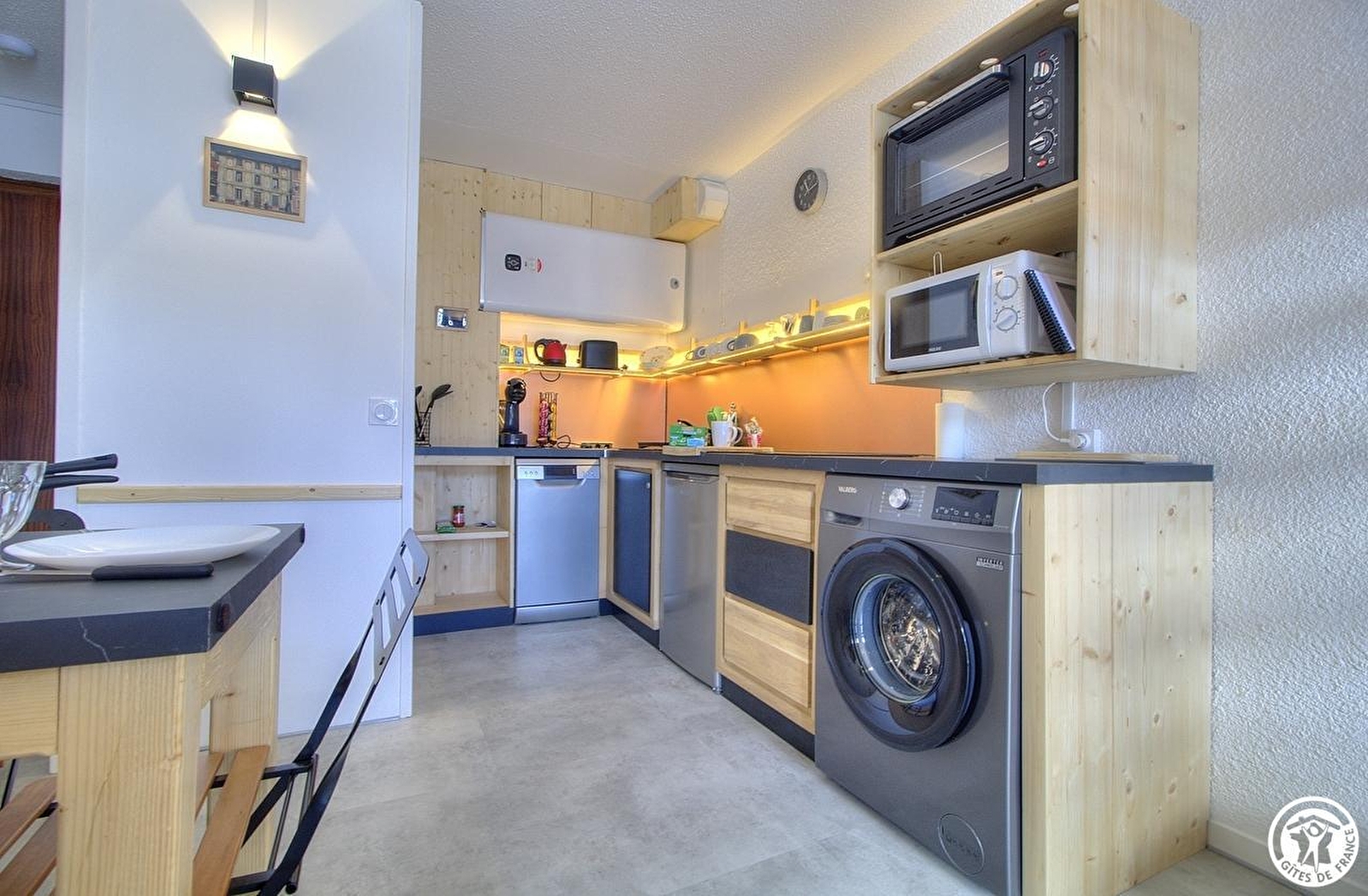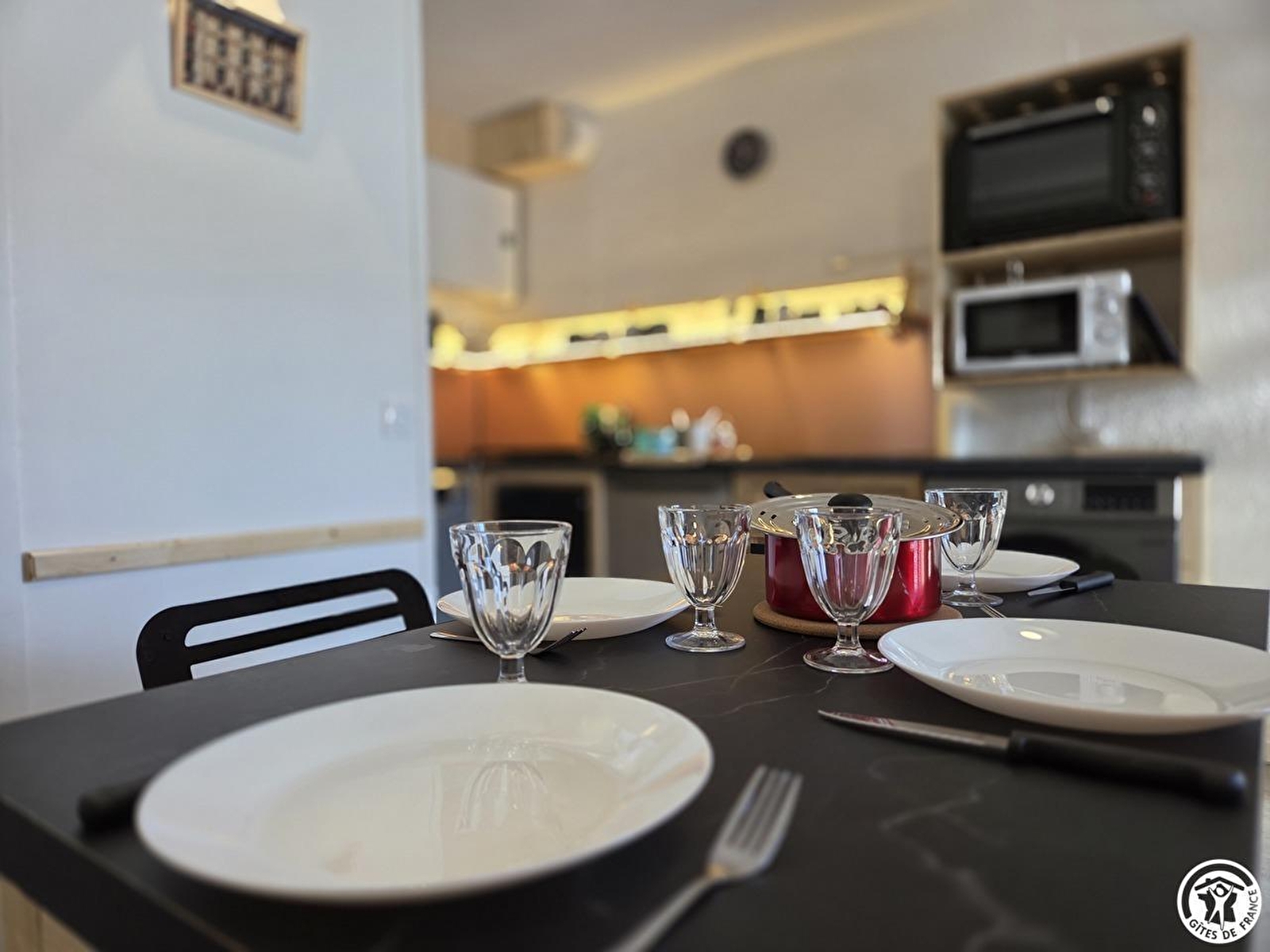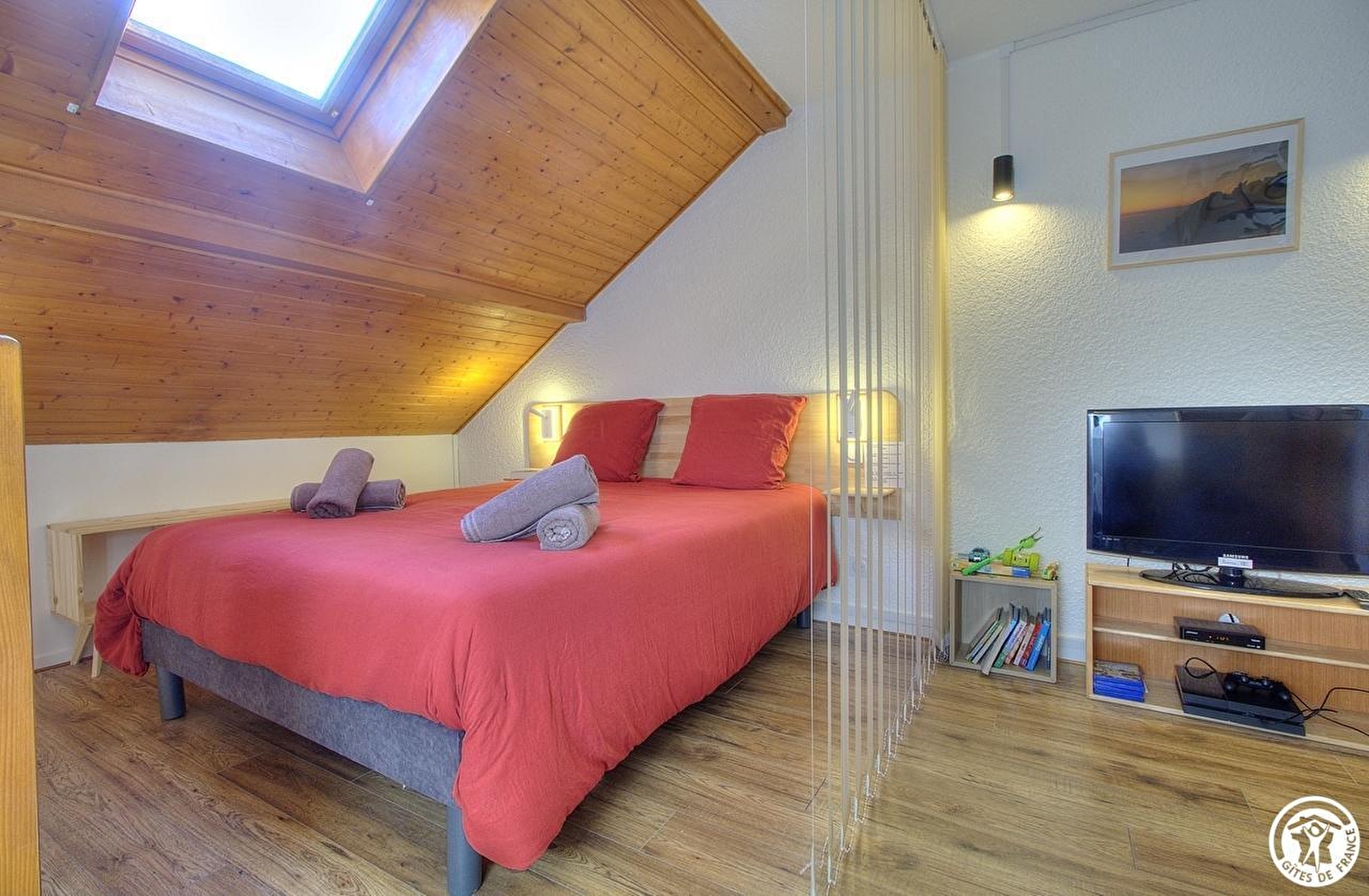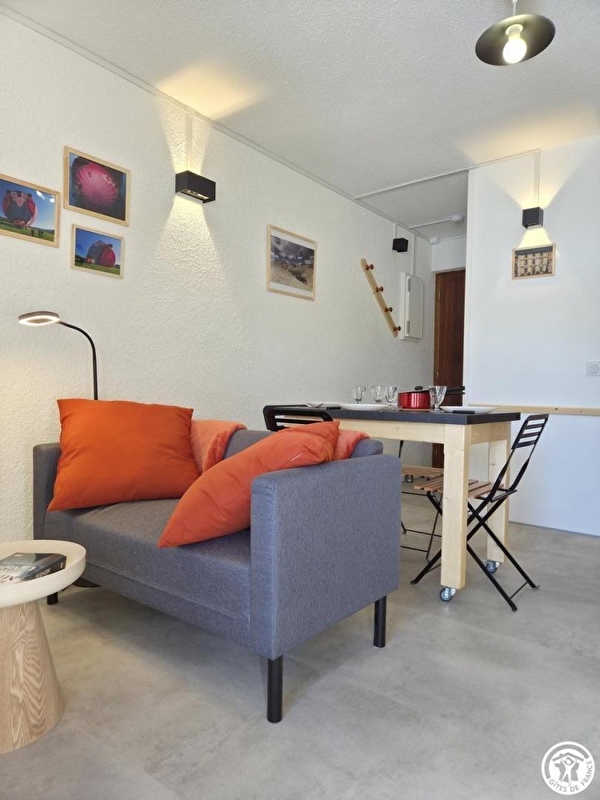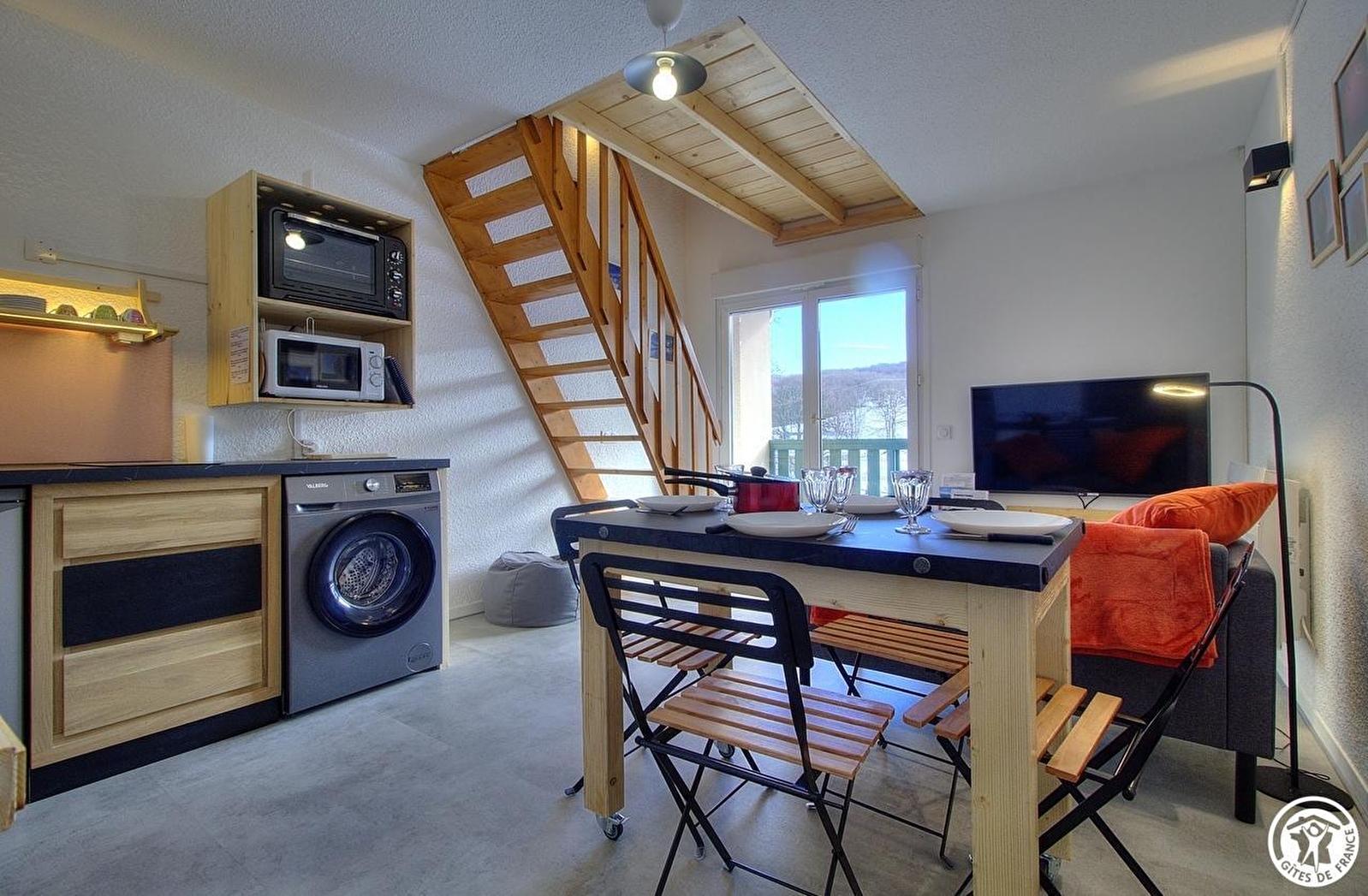 Ce gîte fonctionnel, sur deux niveaux, peut accueillir jusqu'à 4 personnes grâce à sa mezzanine parfaitement optimisée. L'entrée se fait par une porte commune aux appartements puis par une entrée indépendante donnant sur la pièce de vie. Chaleureuse et conviviale, elle propose une cuisine équipée ouverte sur l'espace repas, ainsi qu'un espace agréable.