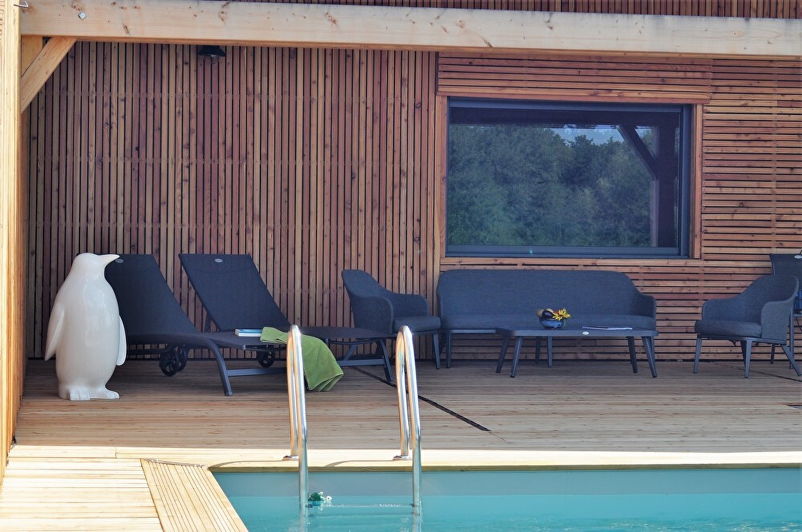 Au cœur des étangs de la Bresse jurassienne, venez vous ressourcer dans ce petit nid douillet niché dans un cadre idéal pour se reposer et profiter pleinement de la nature environnante et du calme de ce charmant petit village. De plain-pied, cette maison bois contemporaine indépendante saura vous ravir par sa modernité, son confort, et la qualité de ses prestations. La grande et lumineuse pièce à vivre est composée d'une magnifique cuisine entièrement équipée et d'un salon avec télévision écran plat et insert à granulés pour rendre encore plus chaleureuses vos soirées hivernales. Une première salle d'eau avec douche et wc est attenante à deux chambres : l'une avec un lit de 160x200 et l'autre avec deux lits de 90x200. Vous trouverez également une 3ème chambre avec un lit de 160x200cm ayant sa propre salle d'eau (douche et wc). Les trois chambres ont une télévision privative. Pour votre plus grand confort, les lits seront faits à votre arrivée, les serviettes de toilettes sont fournies et le ménage est inclus. Côté extérieur, la grande terrasse abritée équipée de mobilier de jardin, idéale en toute saison, est une véritable invitation à la détente. Elle dessert une jolie piscine creusée (6m * 4m * 1.3 m de profondeur) accessible à la belle saison, lorsque les températures le permettent, ainsi qu'un vaste terrain attenant. Un bain nordique est à votre disposition hors période estivale. Pour les amateurs de randonnées, la voie verte se trouve à deux pas du gîte ! ( Des vélos sont à votre disposition). N'attendez plus pour venir découvrir ce petit paradis !
