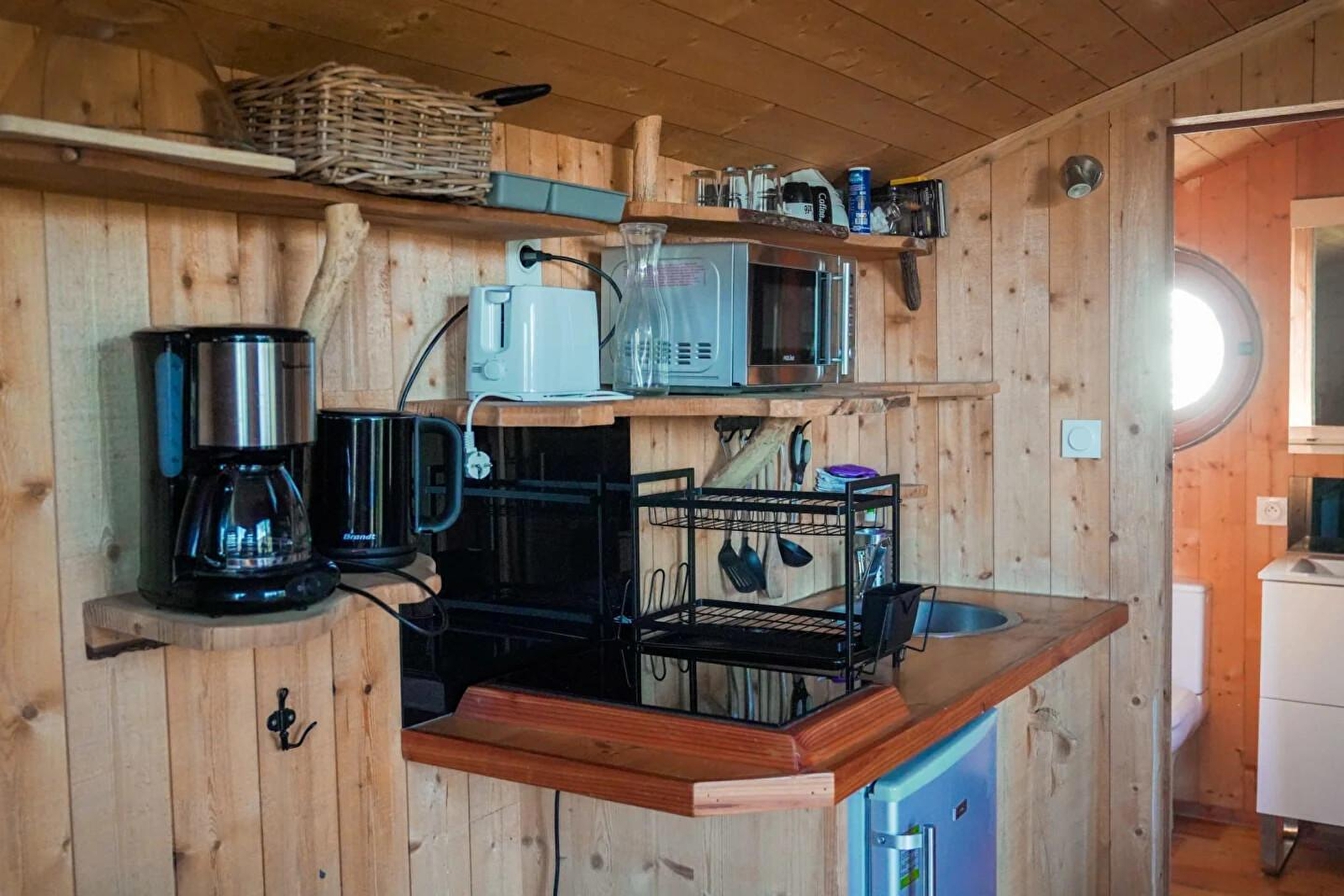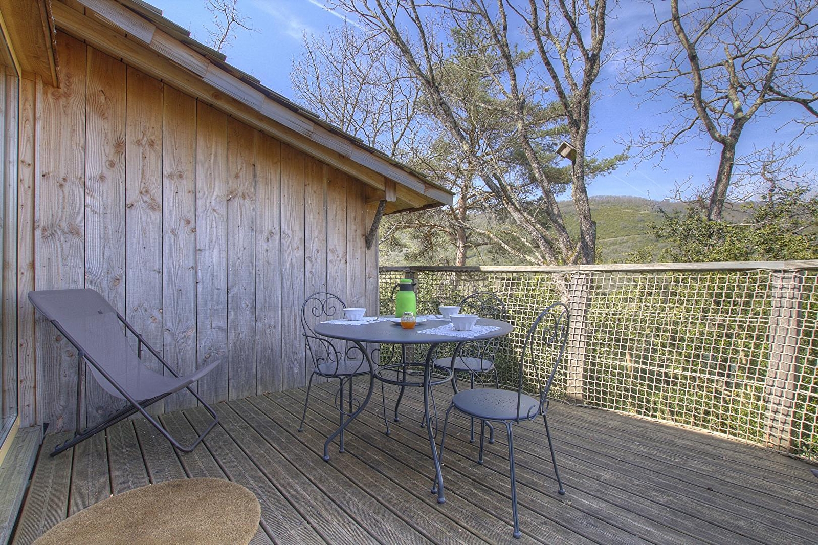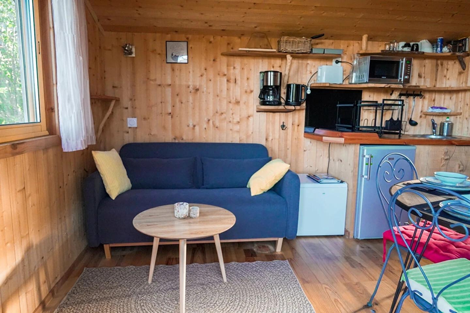 Sa terrasse en arrondie est en soit une véritable pièce de de vie avec son espace repas et ses chaises longues. Elle est exposée soleil couchant et pendant l'été, l'exposition se fait de midi jusqu'en soirée. Une grande baie vitrée partage l'extérieur de la pièce de séjour principale composée d'un coin repas avec sa banquette rouge, et d'une kitchenette (2 plaques vitro céramiques, un four micro-onde et un frigo). Cette cabane offre le luxe d'une chambre privative, avec un lit 2 personnes de 150 cm de bois. L'accès à la salle d'eau et au wc se fait par la pièce de vie principale. Possibilité d'un couchage supplémentaire dans la pièce de vie. A votre arrivée, un kit avec les produits de "base" vous est remis. Sur demande, un panier "petit déjeuner" vous sera porté le matin. Nos coups de cœur : la terrasse, sa vue bien évidemment et sa luminosité, chaque pièce est dotée d'une fenêtre. La Pinède fait partie d'un site "nature" comprenant au total 7 cabanes et lodges complètement intégrées dans cette forêt de buis, nichée sur les hauteurs de Serrières sur Ain, en aplomb de la rivière d'Ain. Chaque cabane a sa propre identité et est construite sur pilotis à 2 mètres du sol, les accès et terrasses sont entièrement sécurisés. Site d'exception, dans les gorges de l'Ain, permettant la pratique du canoë, aviron ou simplement baignade. En hauteur sur les falaises, possibilité de randonner, avec GR et PR. Avec un peu de chance, de la patience et des levers matinaux, vous pourrez peut être observer les chamois qui viennent parfois pâturer sur les pelouses sèches. -10% sur les séjours de 4 nuits du lundi au jeudi (sauf du 01/07 au 31/08/2019).