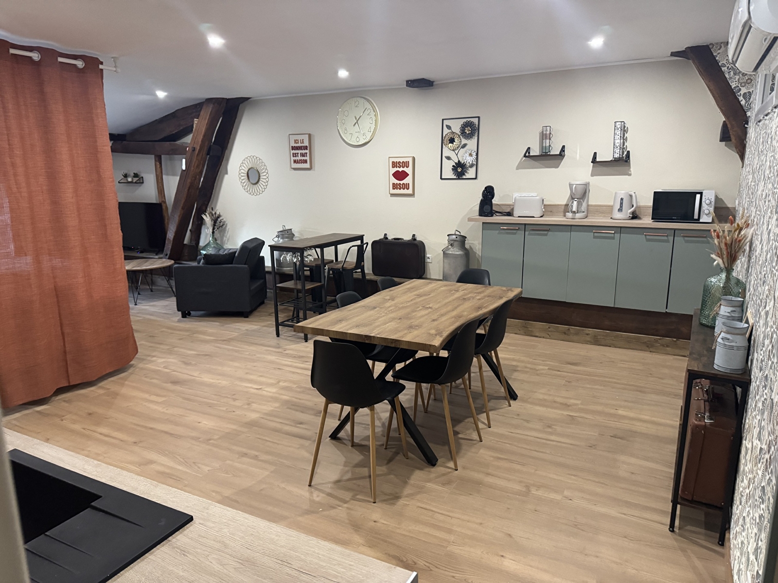 Coin cuisine entièrement équipé, coin petit déjeuner.