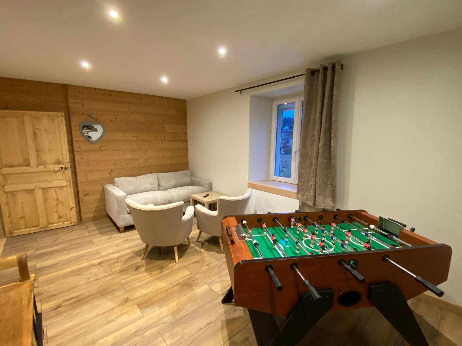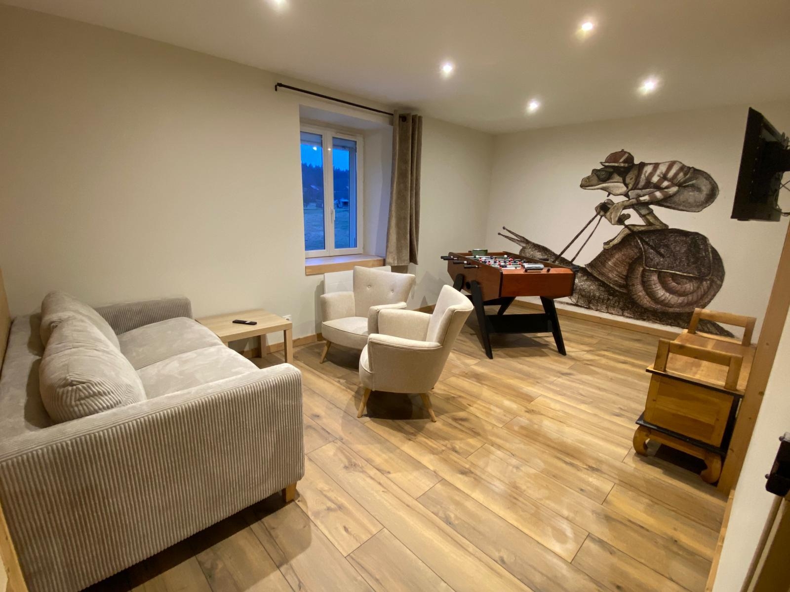 . 1 petit salon avec télé, baby foot et canapé convertible