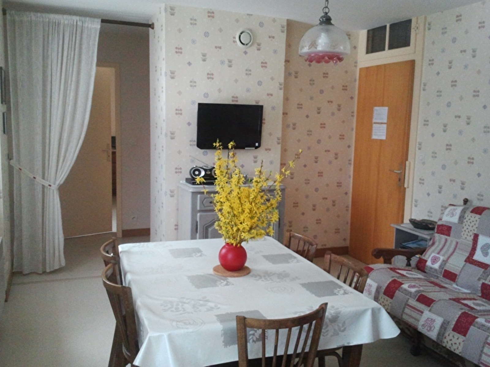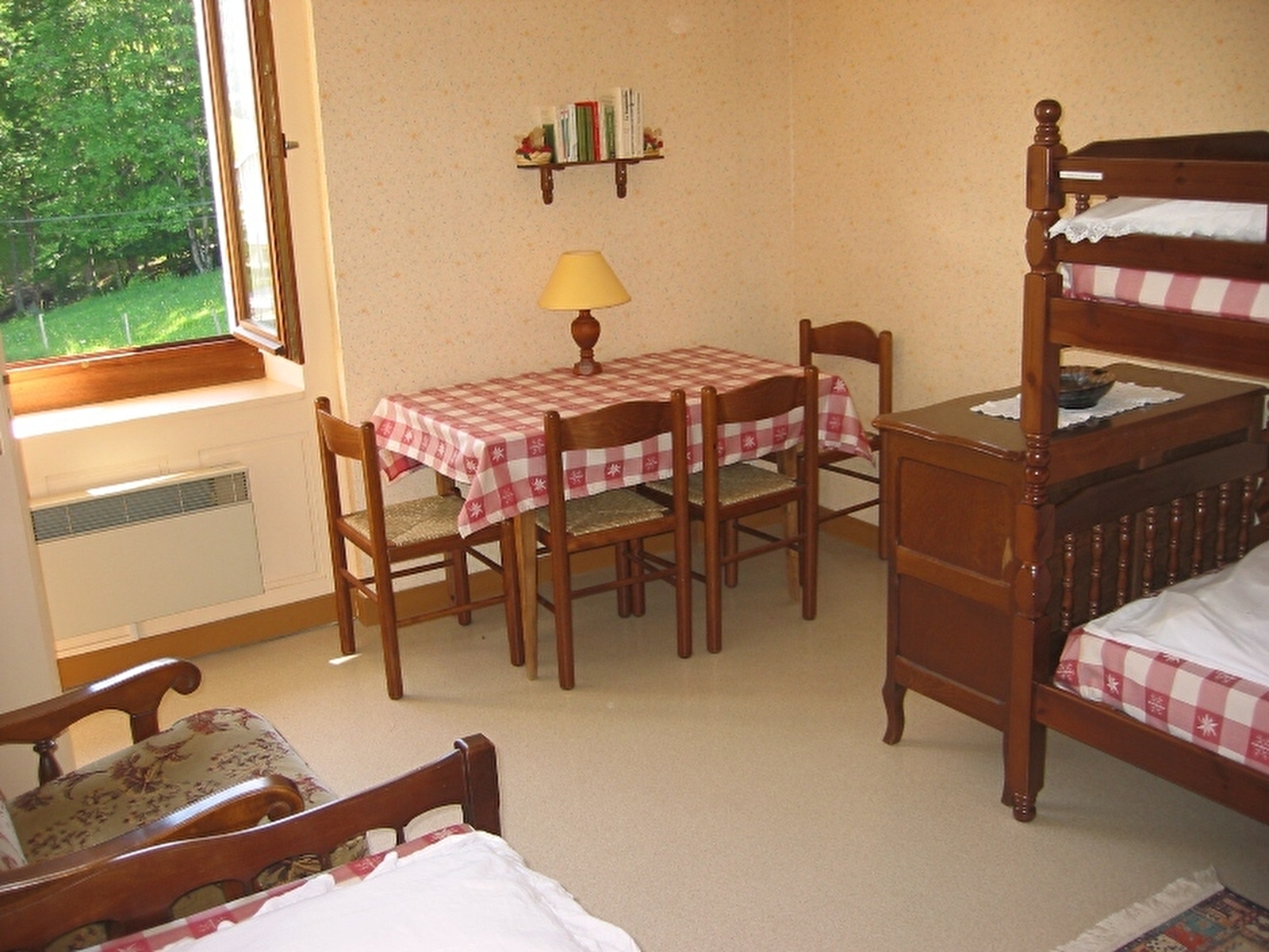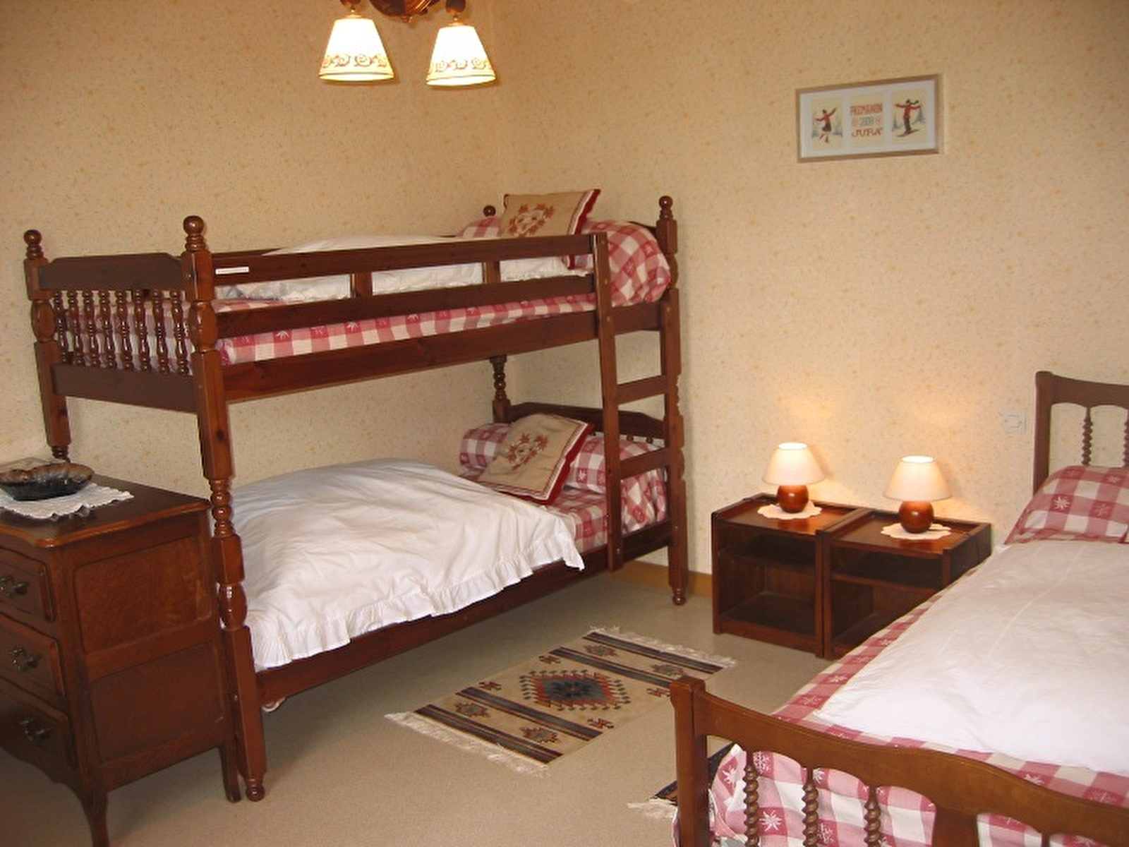 Appartement confortable idéalement situé à proximité des pistes de ski et de nombreux sentiers de randonnée. Au 2ème étage : une pièce à vivre avec cuisine, espace repas et coin détente, une 1ère chambre avec 1 lit en 140 et une 2ème chambre avec un lit 1 place en 100x190 et 2 lits 1 place superposés. Salle d'eau avec douche, 2 lavabos, wc séparés. Terrain non clos autour du gîte à votre disposition avec salon de jardin. Garage privatif. Parking sur place - volets dans les chambres