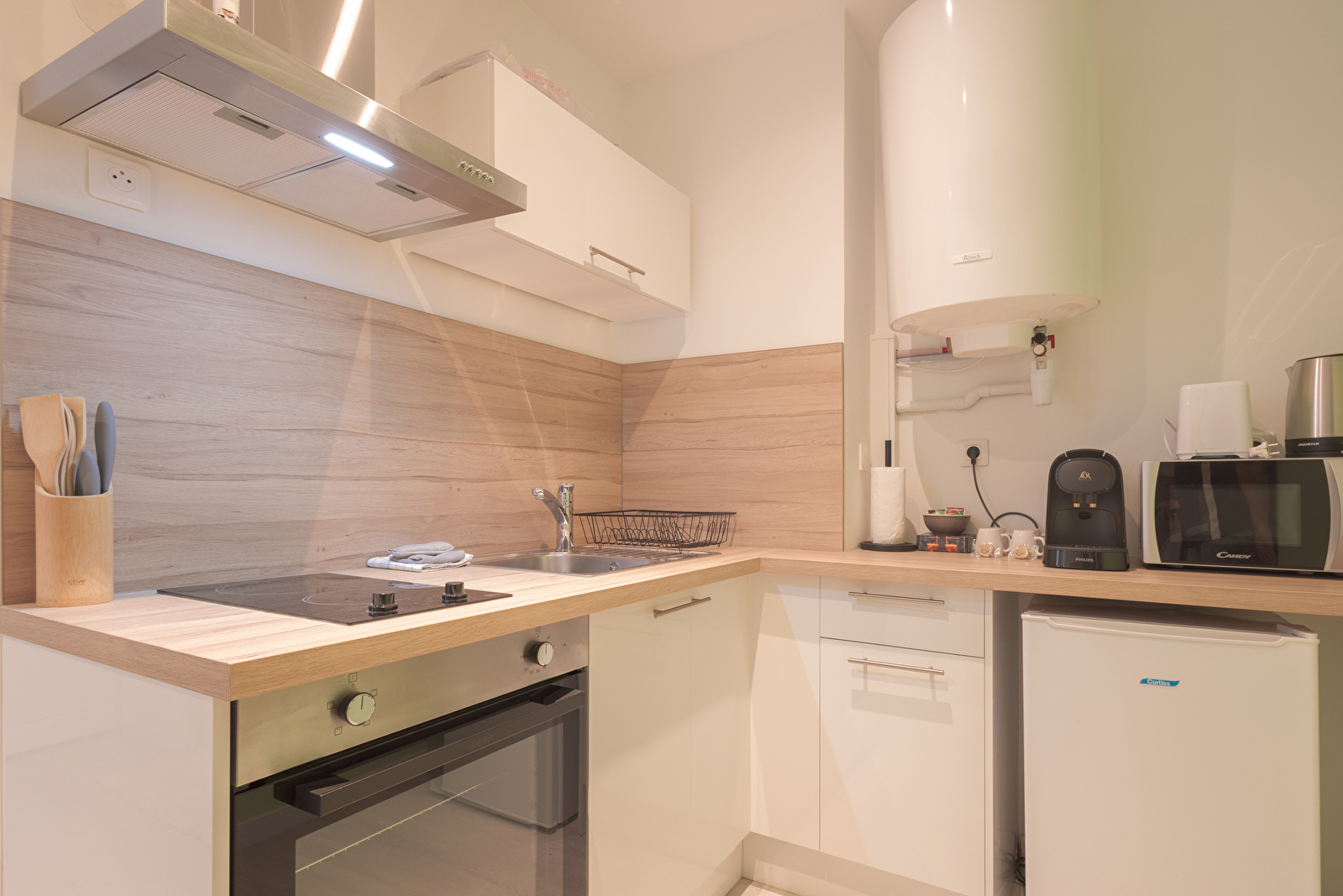 -Cuisine équipée : cafetière Nespresso, plaques de cuisson, micro-ondes, réfrigérateur, vaisselle…