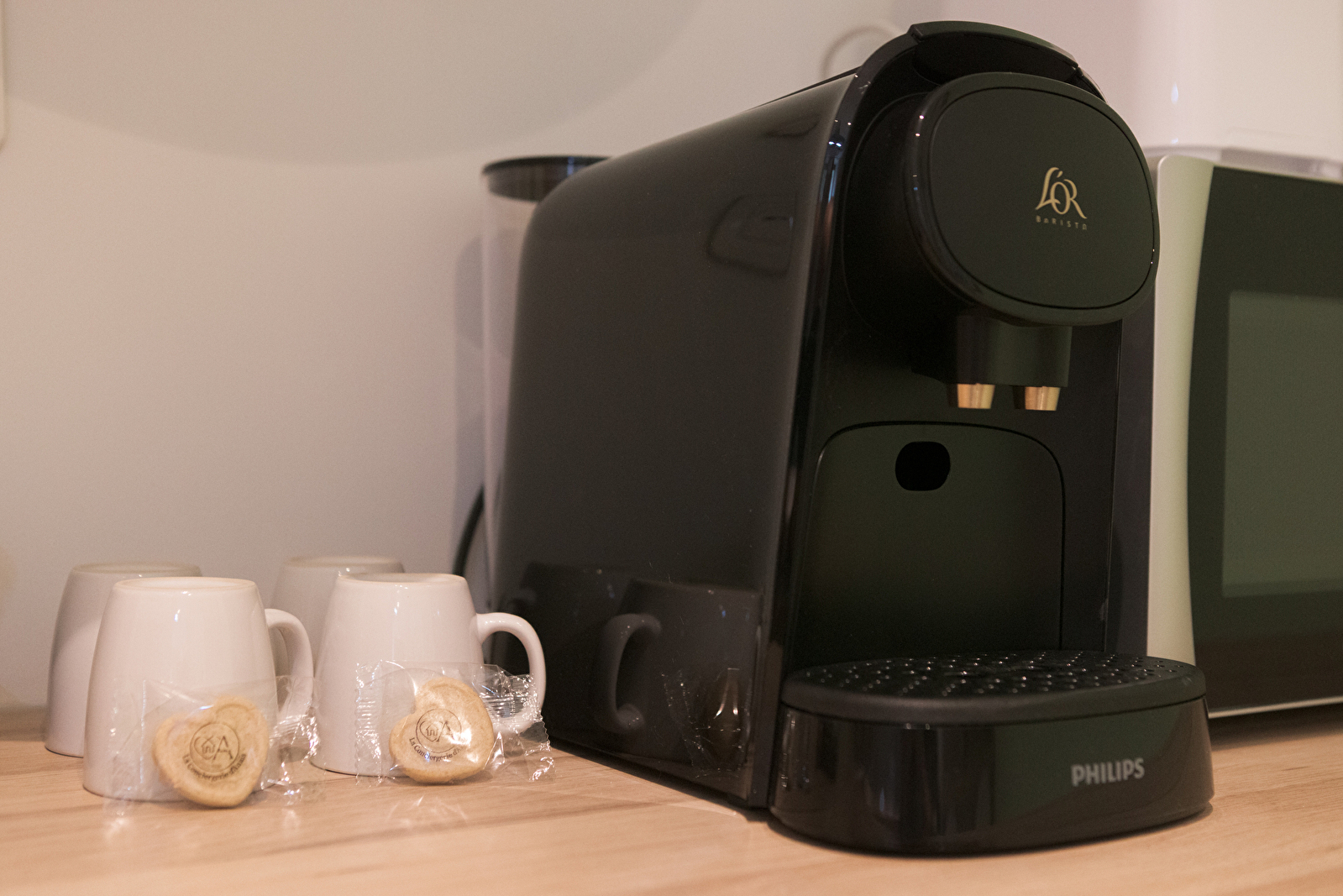 -Kit d’accueil : produits de salle de bain, capsules de café, sachets de thé, sucre et rouleau de papier toilette