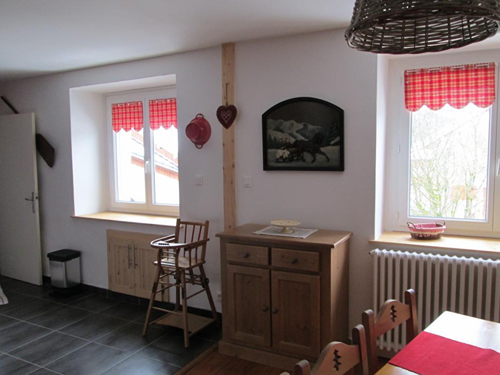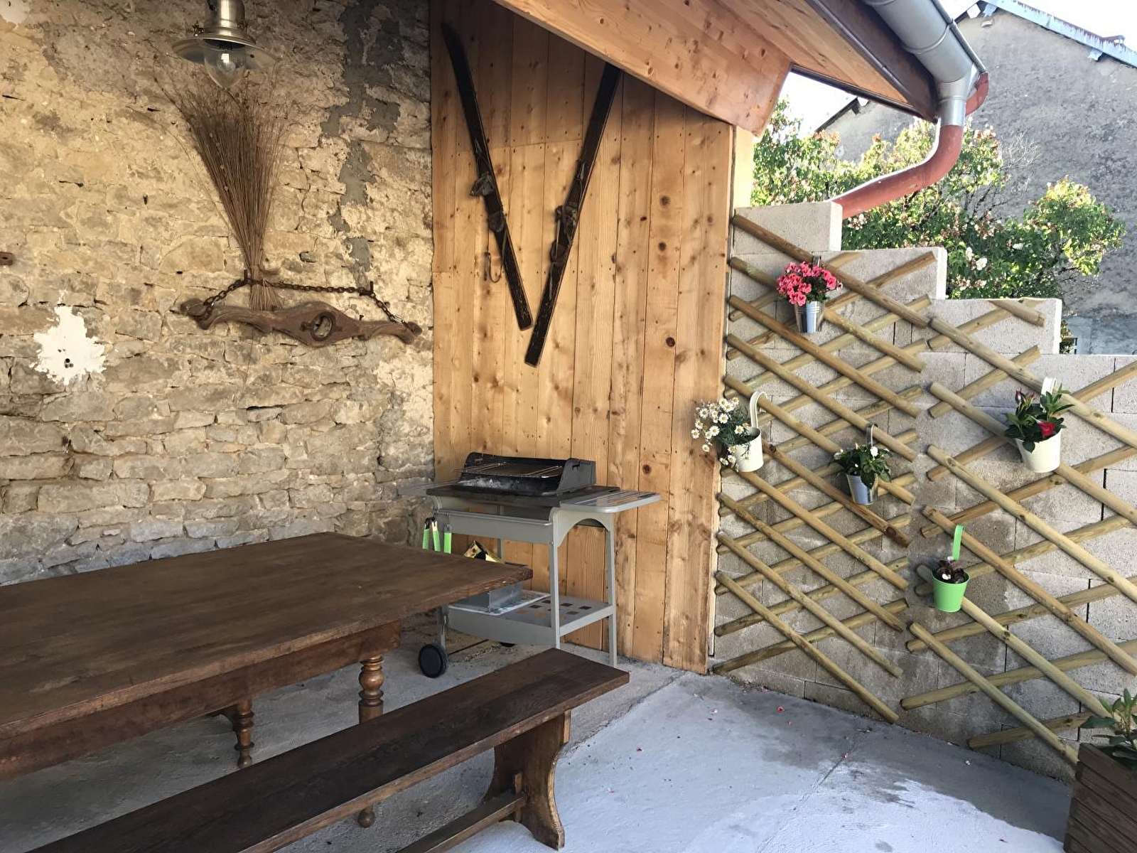 Gîte agréable décoré avec goût, situé au 1er étage d'une maison, à quelques kilomètres de la rivière l'Ain (1ère catégorie). Hall d'entrée, cuisine entièrement équipée, pièce à vivre avec salle à manger et salon (poele à bois), Ch1 : 1 lit 2 places, salle d'eau (douche), WC indépendant, Ch2 : 1 lit 2 place et 2 lits 1 place superposés. Terrain privatif situé au RDC du gîte avec salon de jardin et barbecue, buanderie en commun avec un autre gîte (lave-linge).