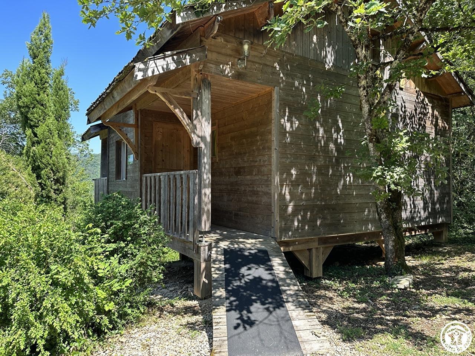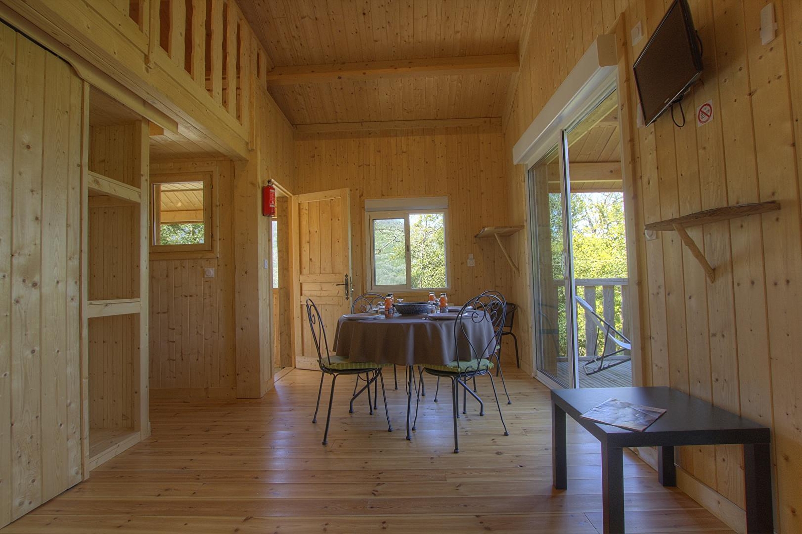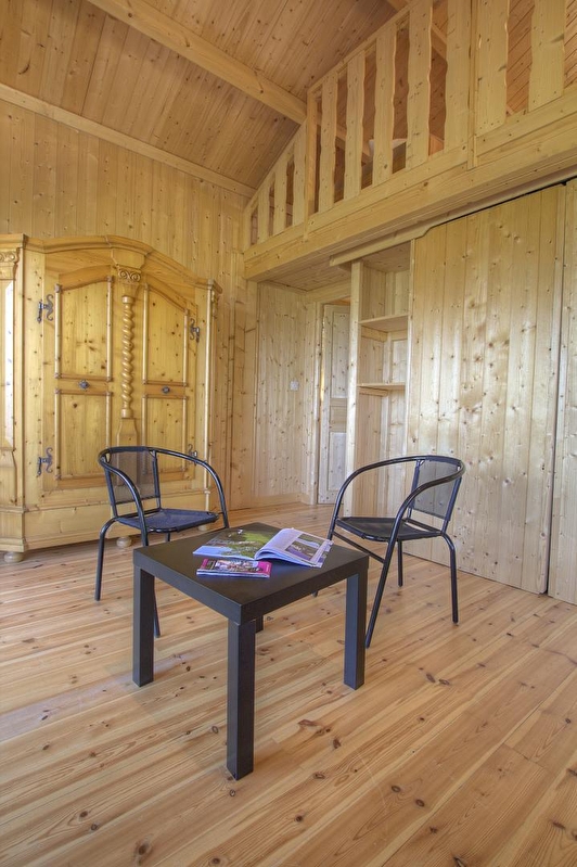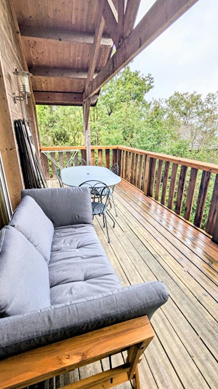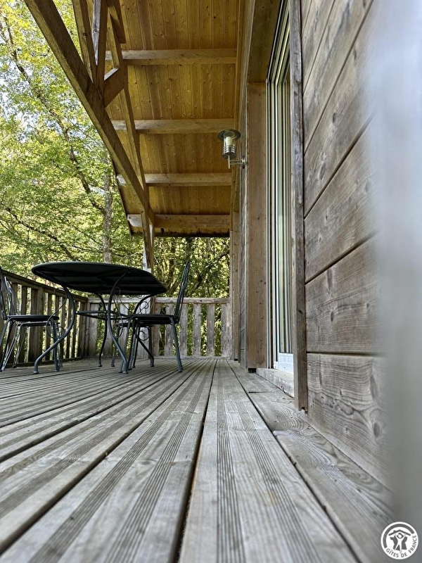 L'accès se fait directement sur la grande pièce de vie, les 2 grandes baies vitrées la prolongent sur la terrasse rectangulaire de 17 m² avec vue plongeante sur la Rivière d'Ain. Aux beaux jours, la terrasse vous permettra de profiter du soleil en après-midi et une partie de la soirée. La pièce de vie principale à l'ambiance vert printemps est aménagé d'un espace repas "ambiance jardin" et, le soir, se transforme en pièce à sommeil avec son couchage pour deux personnes (lit en 150 cm) intégré dans un rangement/placard mural. La mezzanine, ouverte, composée de deux lits 90 cm dont l'accès se fait par un escalier "étroit" donne également sur la pièce de vie. Son accès cocooning permet une véritable intimité. A l'écart de la pièce de vie, au pied de l'escalier de la mezzanine, se trouve une kitchenette pratique tout confort avec 2 plaques vitro céramique, un petit frigo avec espace congélateur et le micro-onde. L'accès à la salle d'eau se fait de la pièce de vie. Un kit avec les produits de " base " vous est remis à votre arrivée. Le Betet également fait partie d'un site " nature " comprenant au total 7 cabanes et lodges complètement intégrées dans cette forêt de buis, niché sur les hauteurs de Serrières sur Ain, en aplomb de la rivière d'Ain. Chaque cabane à sa propre identité et est construite sur piloti à 2m du sol, les accès et terrasse sont entièrement sécurisés. Site d'exception, dans les gorges de l'Ain, permettant la pratique du canoë, aviron ou simplement baignade. En hauteur sur les falaises, possibilité de randonner, avec GR et PR.