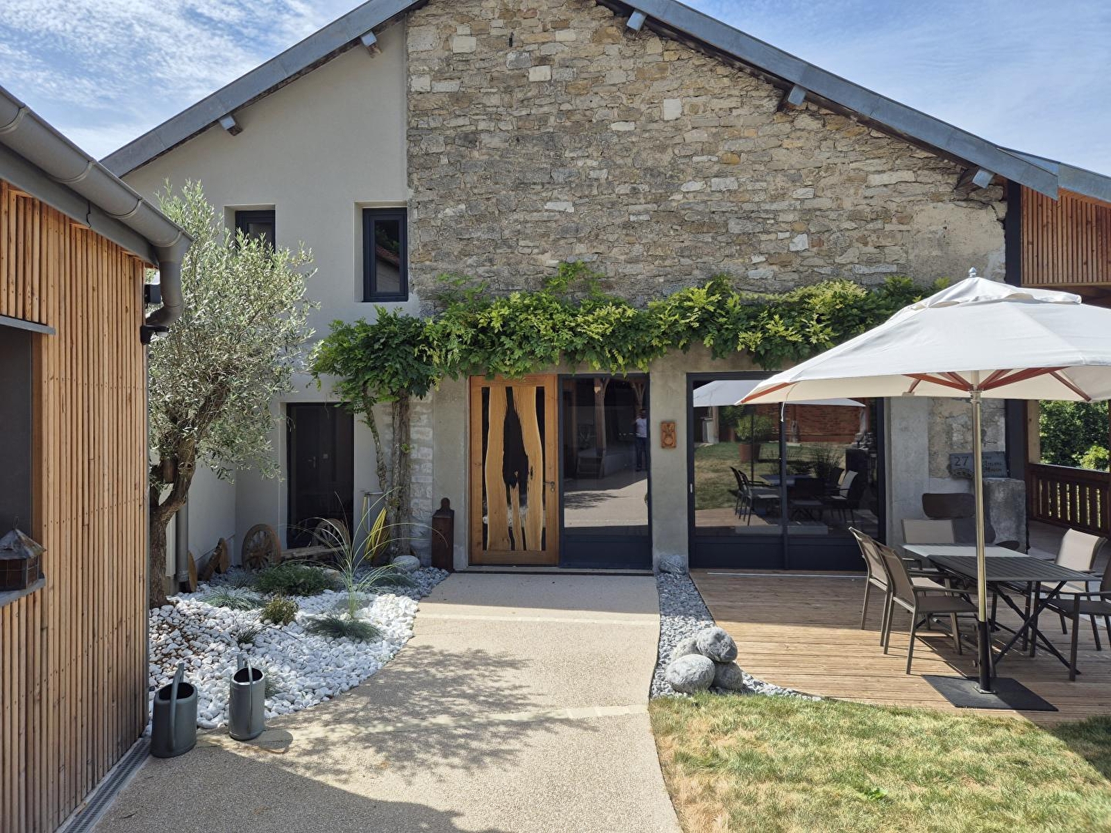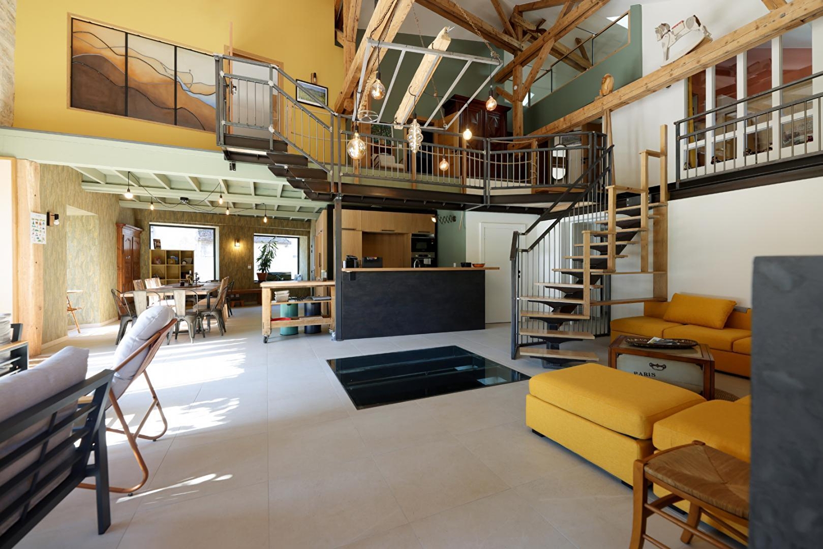 Située au pied d'une reculée, à quelques pas du centre-ville, la propriété séduit par son ambiance champêtre. Vous y trouverez jardins, verger, canal et rivière. Entièrement aménagé en 2024 dans un ancien atelier de menuiserie construit sur un vieux moulin, le gîte vous accueille avec un grand espace séjour ouvert et lumineux de 90 m² surmonté de mezzanines. Cet espace comprend salon, salle à manger et cuisine, Il donne vue sur la roue du moulin en sous-sol. Vous mettez en mouvement cette dernière à votre guise. Le gîte étant prévu pour 14 personnes, les chambres et commodités mises à disposition pour 8 personnes sont fonction de la composition du groupe et de ses desiderata, jusqu’à 4 chambres et 3 ou 4 salles de bains. Le rez-de-chaussée du gîte propose deux chambres : l'une avec un lit double (160 cm), l'autre avec deux lits simples modulables, ainsi que deux salles d'eau et deux WC. À l'étage, quatre chambres peuvent accueillir jusqu'à 8 personnes (un lit double de 180 cm et six lits simples modulables), avec trois salles d'eau et un WC indépendant. À l'extérieur, une terrasse en bois donne sur la pelouse, une autre surplombe le verger, offrant une vue panoramique sur la propriété et le paysage. La galerie nord, suspendue et couverte, est idéale en été pour sa fraîcheur. Elle donne sur la rivière et le relief en vis-à-vis. Vous aurez accès au verger, aux cheminements sur la propriété, à un bassin, au ruisseau qui longe le moulin, aux berges d'une rivière peu profonde et au petit canal qui traverse la propriété. Ce gîte est situé en bordure de la route qui mène aux lacs et aux stations de ski. Le tarif de la location inclut une consommation électrique "raisonnable" incluant le chauffage. Le propriétaire se réserve le droit de demander en fin de séjour un supplément basé sur la consommation réelle et n'excédant pas 120 €.