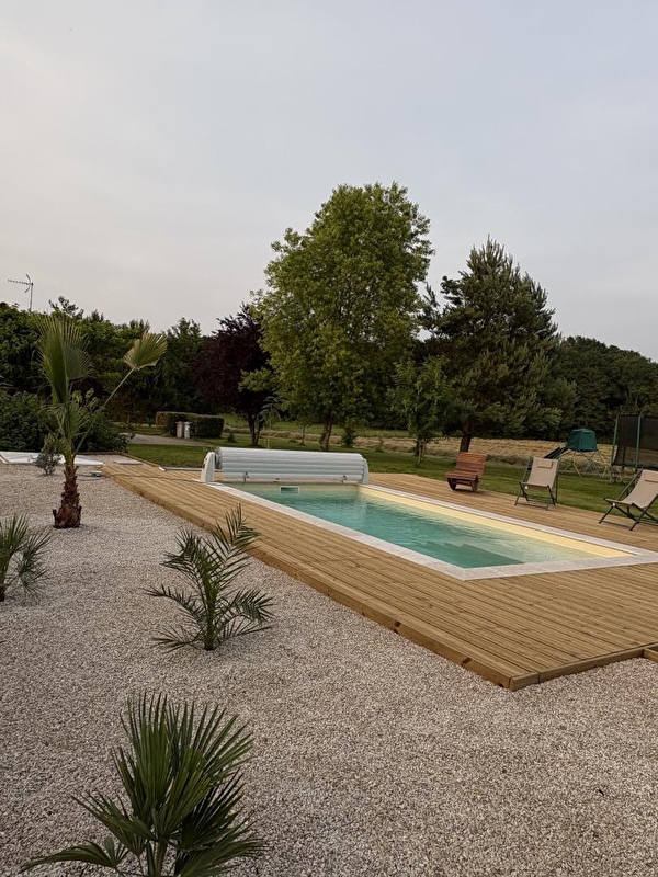 Chalet indépendant situé dans l'enceinte d'une petite ferme ( poules, ânes, canards). Séjour- salon avec canapé convertible, coin-cuisine, micro-ondes, congélateur, lave vaisselle, lecteur DVD/CD, salle d'eau, WC indépendant, ch1: 1 lit 2 pl, ch2: 2 lits 1 pl, ch3 : 2 lits 1 pl, équipement pour bébé, chauffage électrique, poêle à bois. Cour, terrasse, jardin, parc attenant clos, salon de jardin, barbecue, piscine avec terrasse, commune avec les propriétaires et un autre gîte (Piscine du propriétaire mise à disposition) , terrain de pétanque, pingpong. Pour votre plus grand confort ce gîte est proposé en tout inclus : lits faits à l'arrivée, linge de toilette et linge de maison fournis, ménage inclus. Borne de recharge électrique : forfait entre 5 et 10 euros par jour.