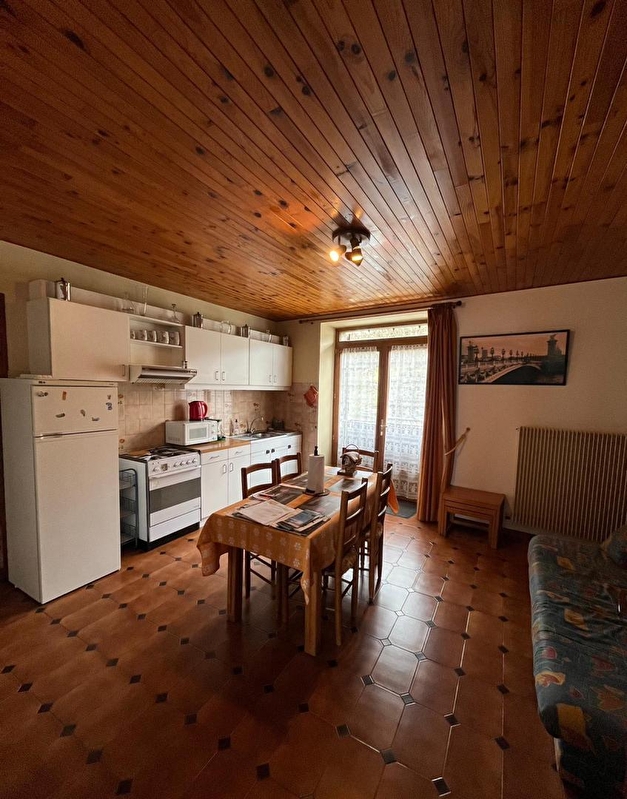 Logement au 2ème étage d'une maison où se trouvent d'autres appartements. Cuisine-séjour avec accès sur un petit balcon, salle de bains, wc indépendants, une chambre avec 1 lit 2 pl, et 1 lit 1 pl. Chauffage central. Toutes charges comprises. Garage sur demande.