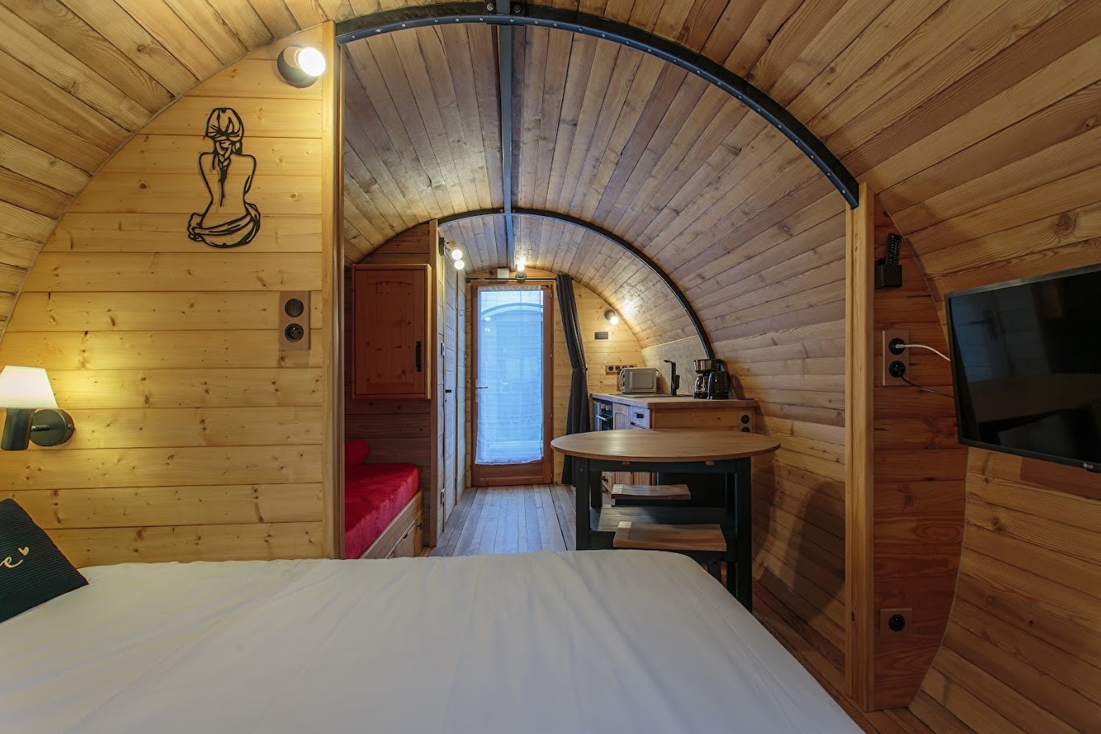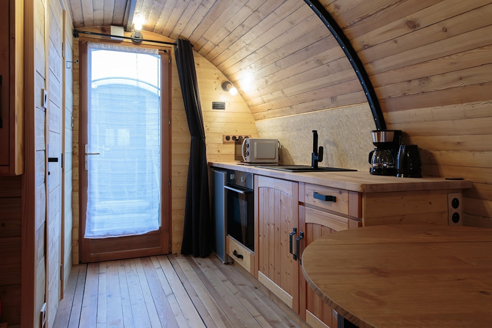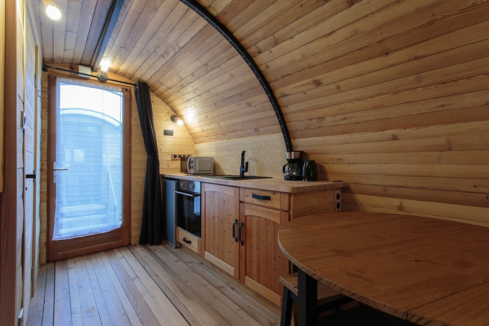 L’intérieur du tonneau a été aménagé pour offrir une ambiance cocooning. Il comprend un espace nuit, un coin repas ainsi qu’un espace cuisine équipé. Le logement dispose également d’une salle d’eau avec douche et sanitaire.