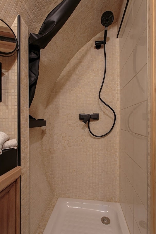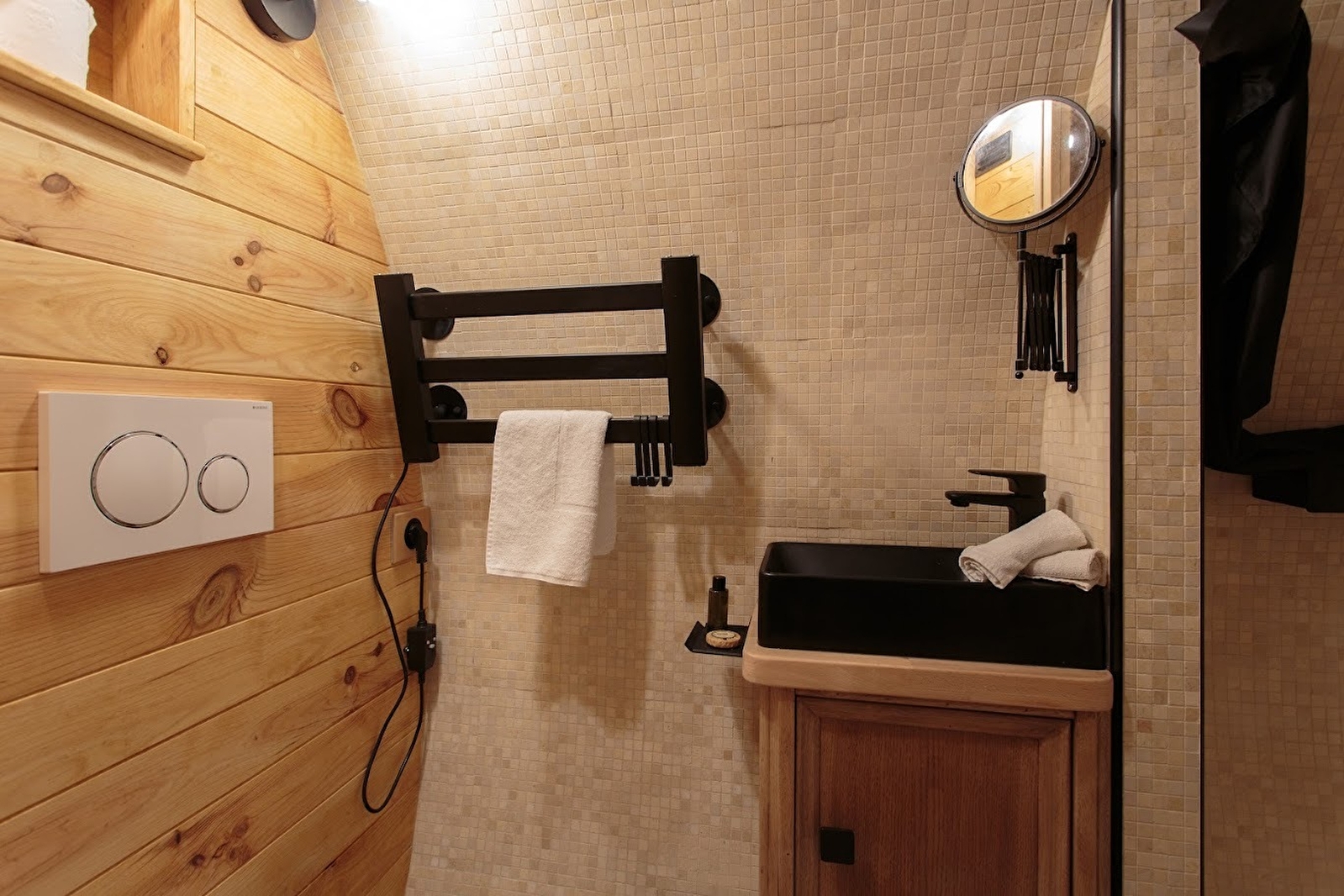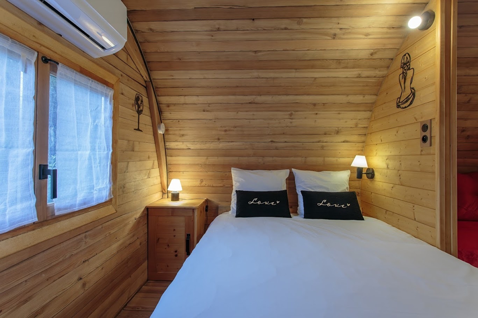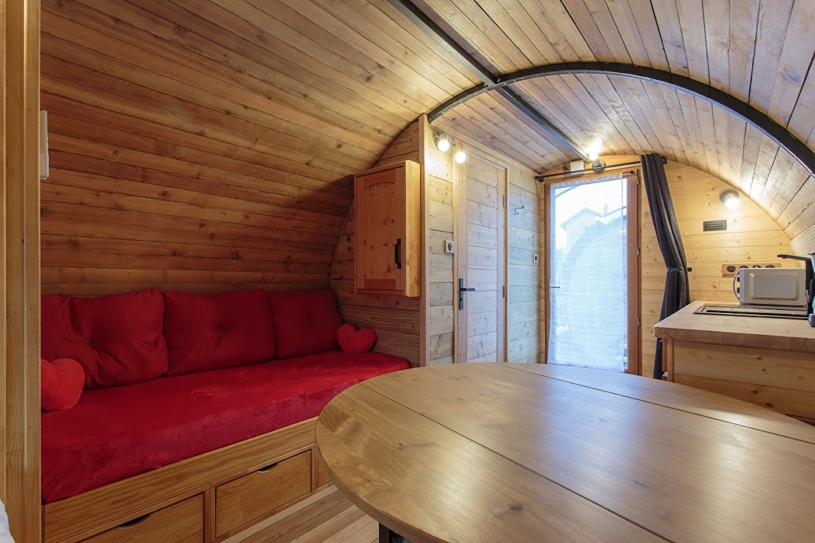 L’intérieur du tonneau a été aménagé pour offrir une ambiance cocooning. Il comprend un espace nuit, un coin repas ainsi qu’un espace cuisine équipé. Le logement dispose également d’une salle d’eau avec douche et sanitaire.