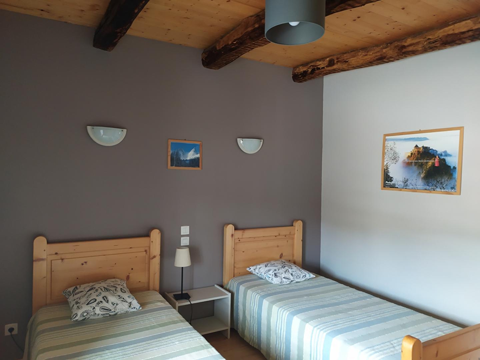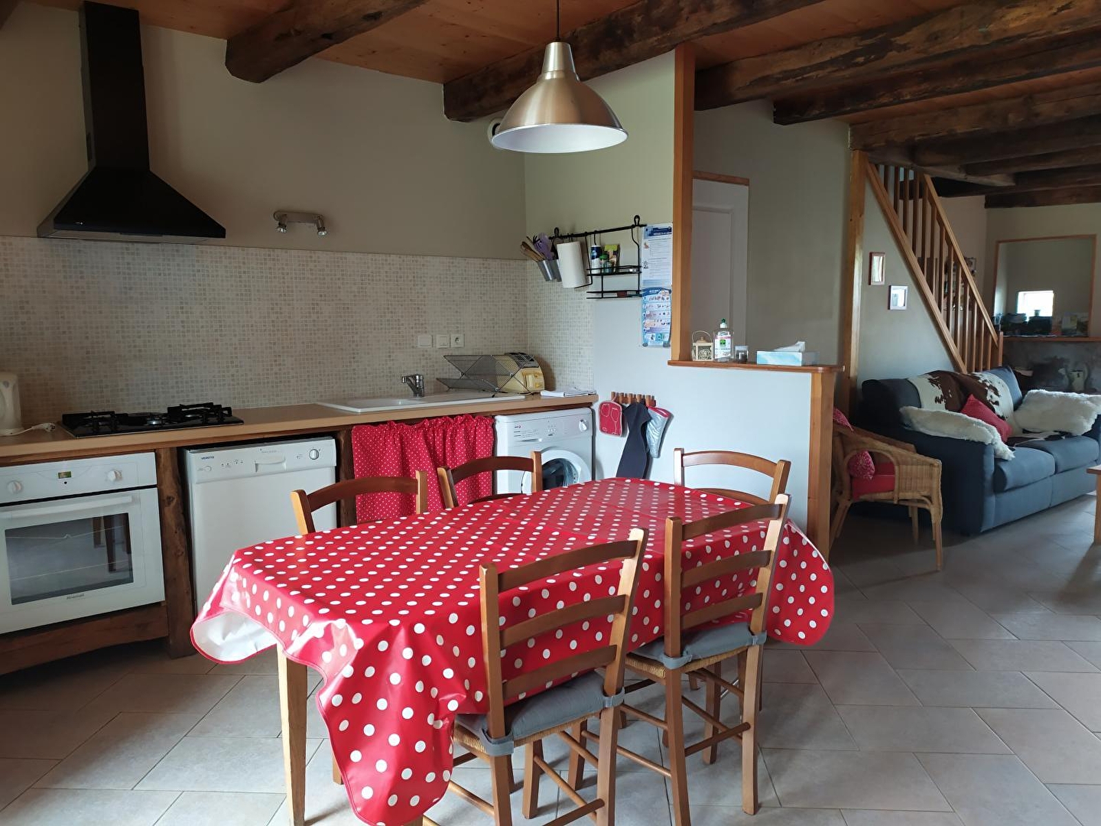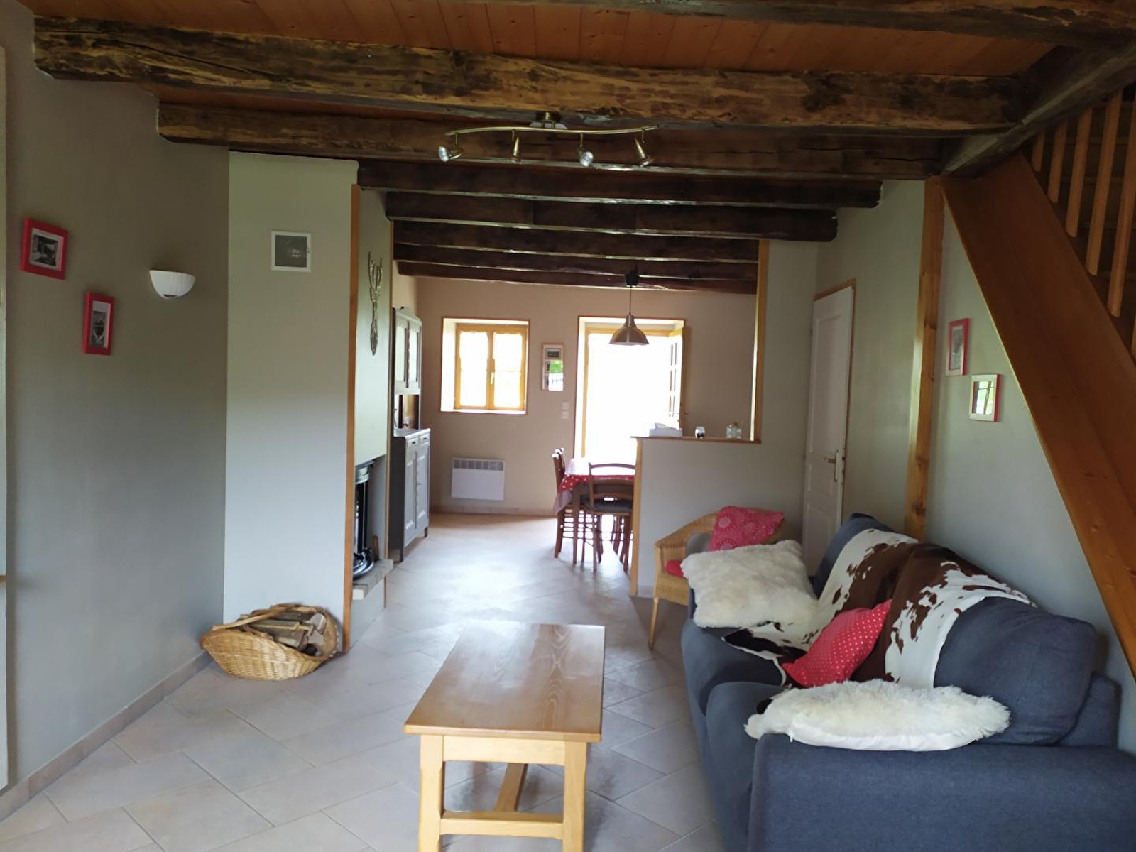 Maison mitoyenne, salon avec coin-cuisine, micro-ondes, canapé convertible, à l'étage: ch1: 2 lits 1 pl, 1 lit bébé, ch2: 1 lit 2 pl, 1 lit 1 pl, salle d'eau, chauffage électrique et bois, terrasse, jardin clos, salon de jardin, barbecue. Toutes charges comprises. Gîte situé en face de la magnifique église romane du village. Equipement bébé à disposition.