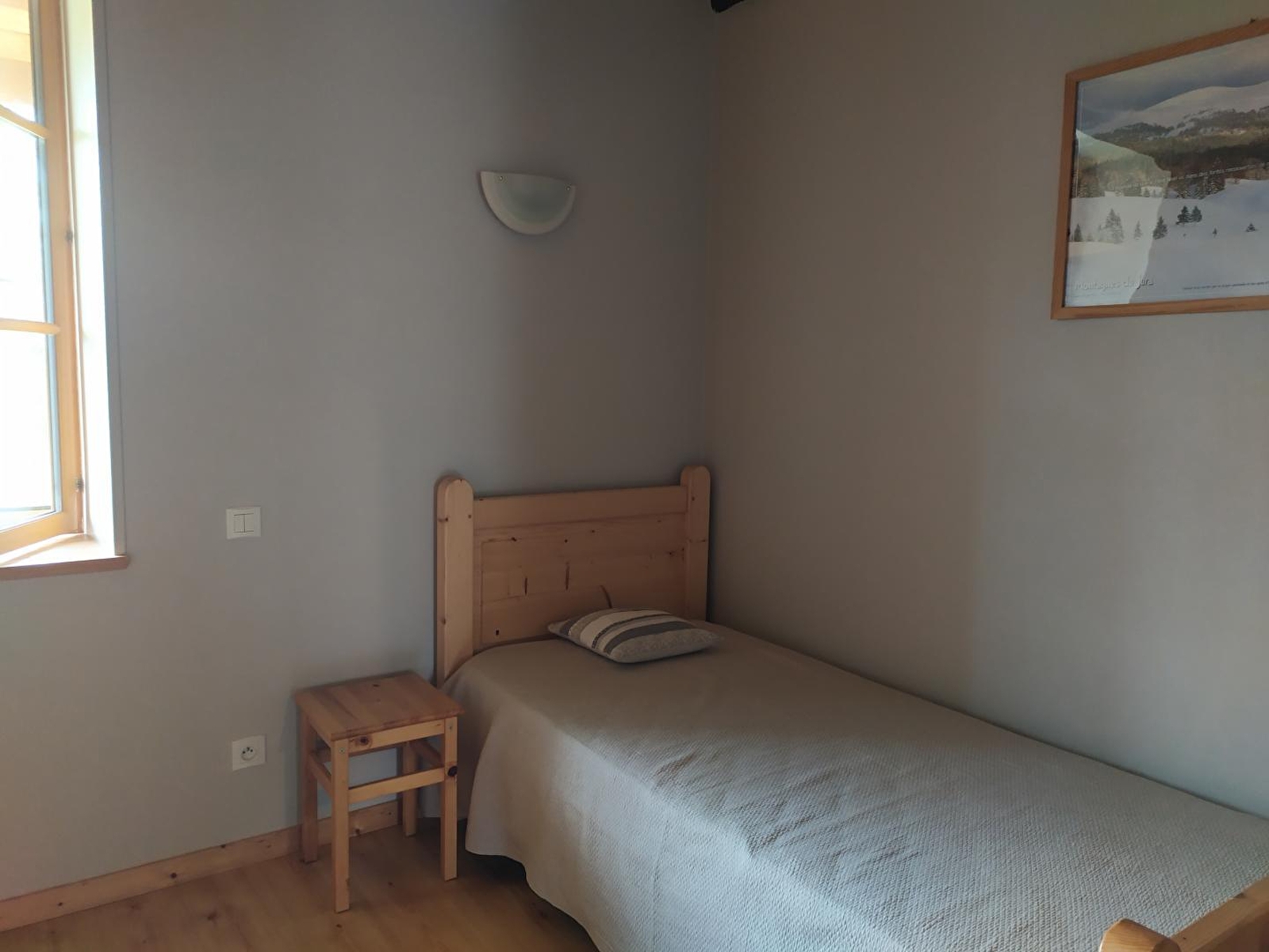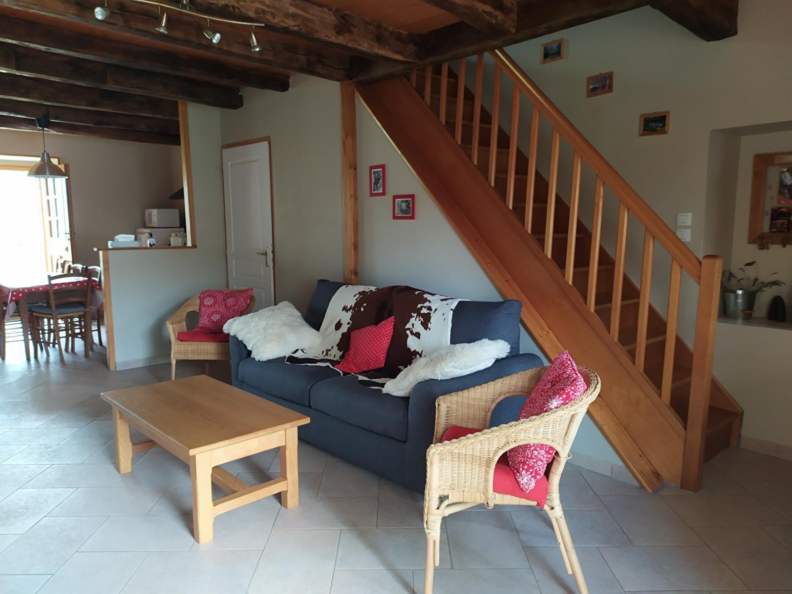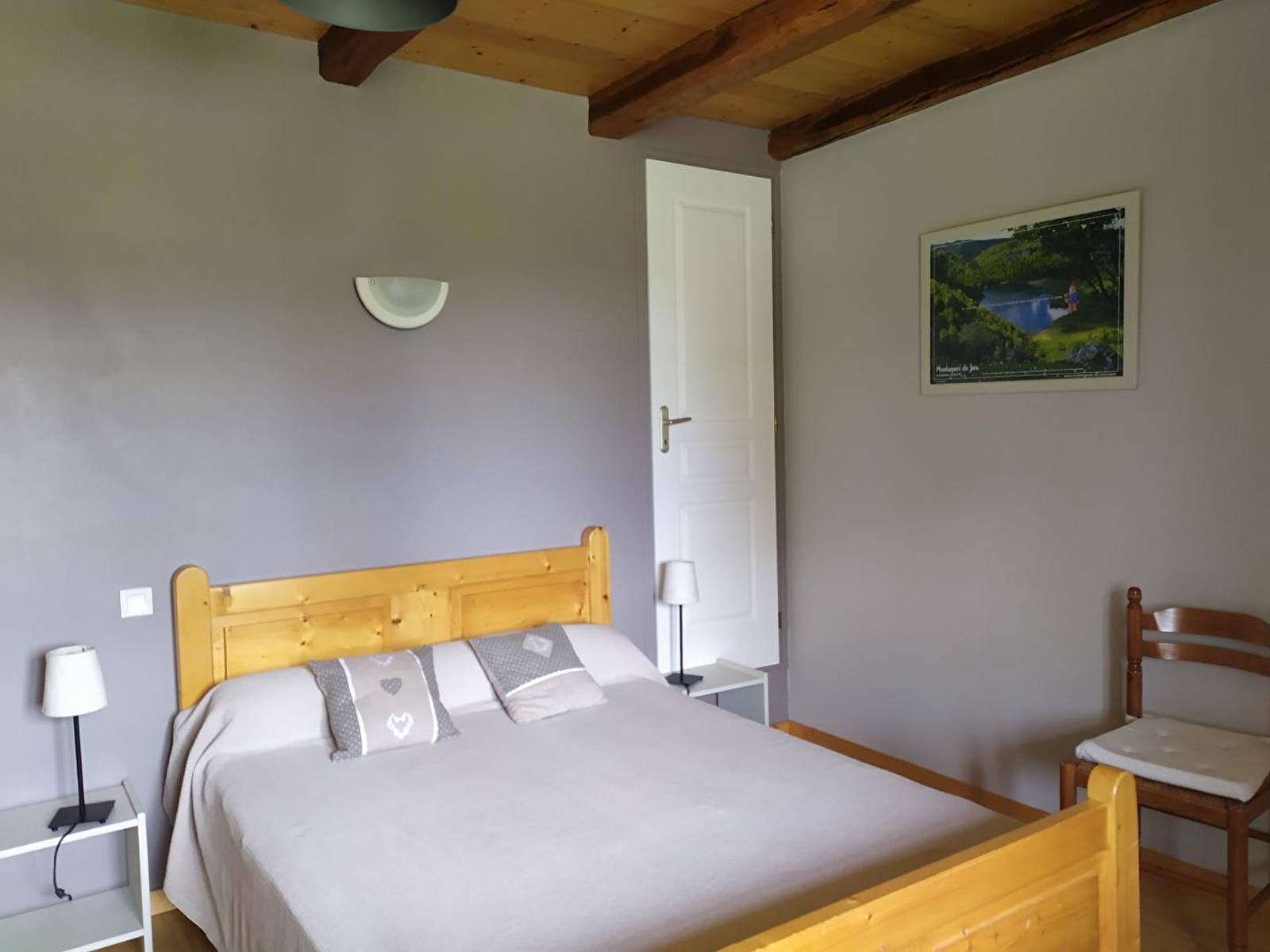 Maison mitoyenne, salon avec coin-cuisine, micro-ondes, canapé convertible, à l'étage: ch1: 2 lits 1 pl, 1 lit bébé, ch2: 1 lit 2 pl, 1 lit 1 pl, salle d'eau, chauffage électrique et bois, terrasse, jardin clos, salon de jardin, barbecue. Toutes charges comprises. Gîte situé en face de la magnifique église romane du village. Equipement bébé à disposition.