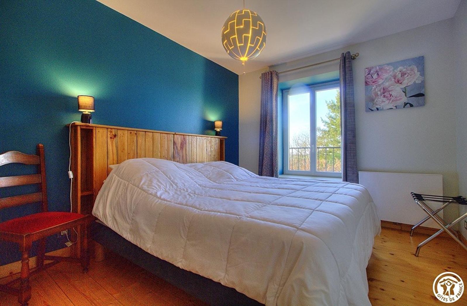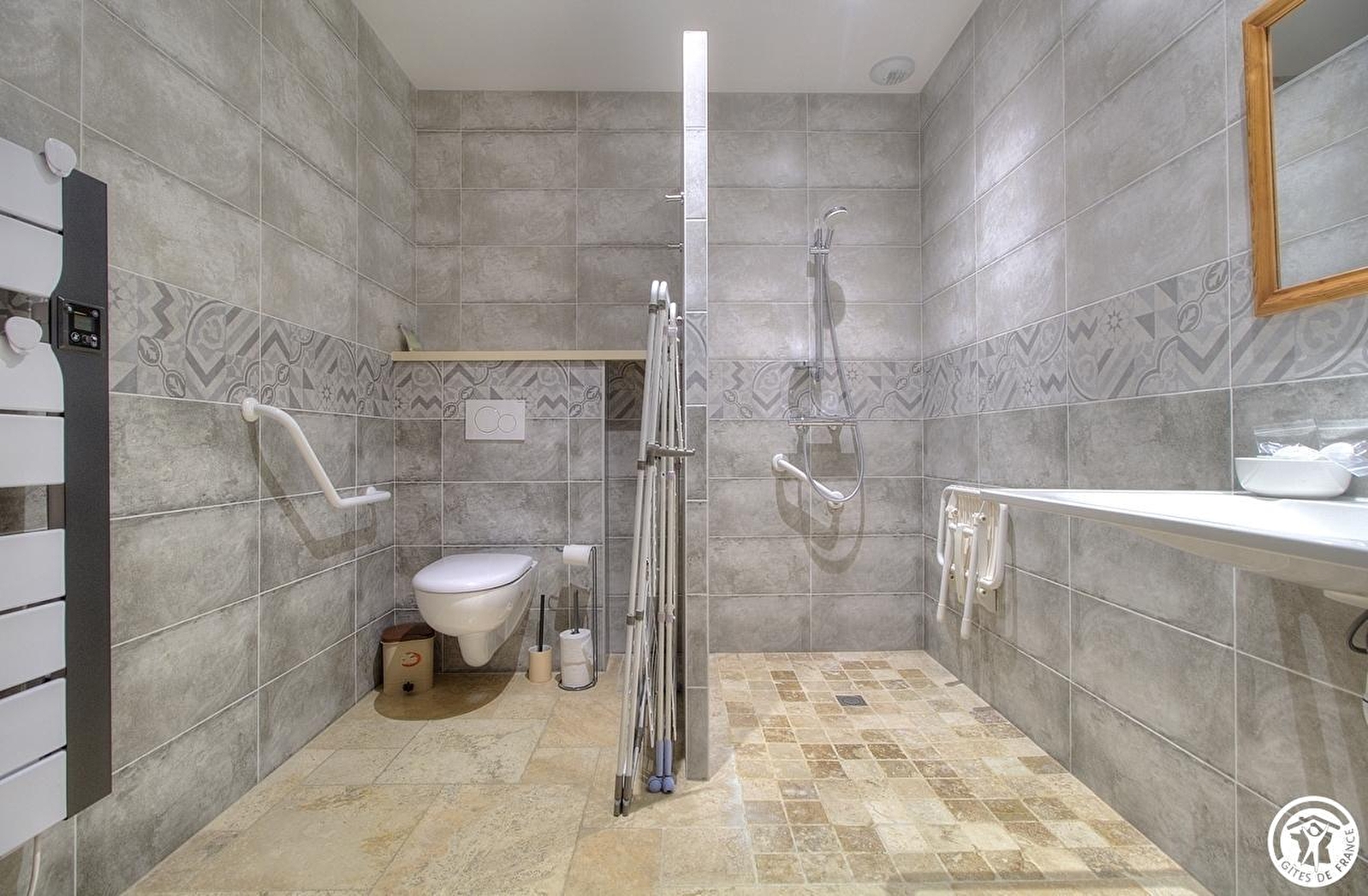Cette entrée dessert également une chambre adaptée aux personnes à mobilité réduite avec 1 lit king size, une salle de bain et WC aux normes handicapés, et un WC indépendant avec lavabo.