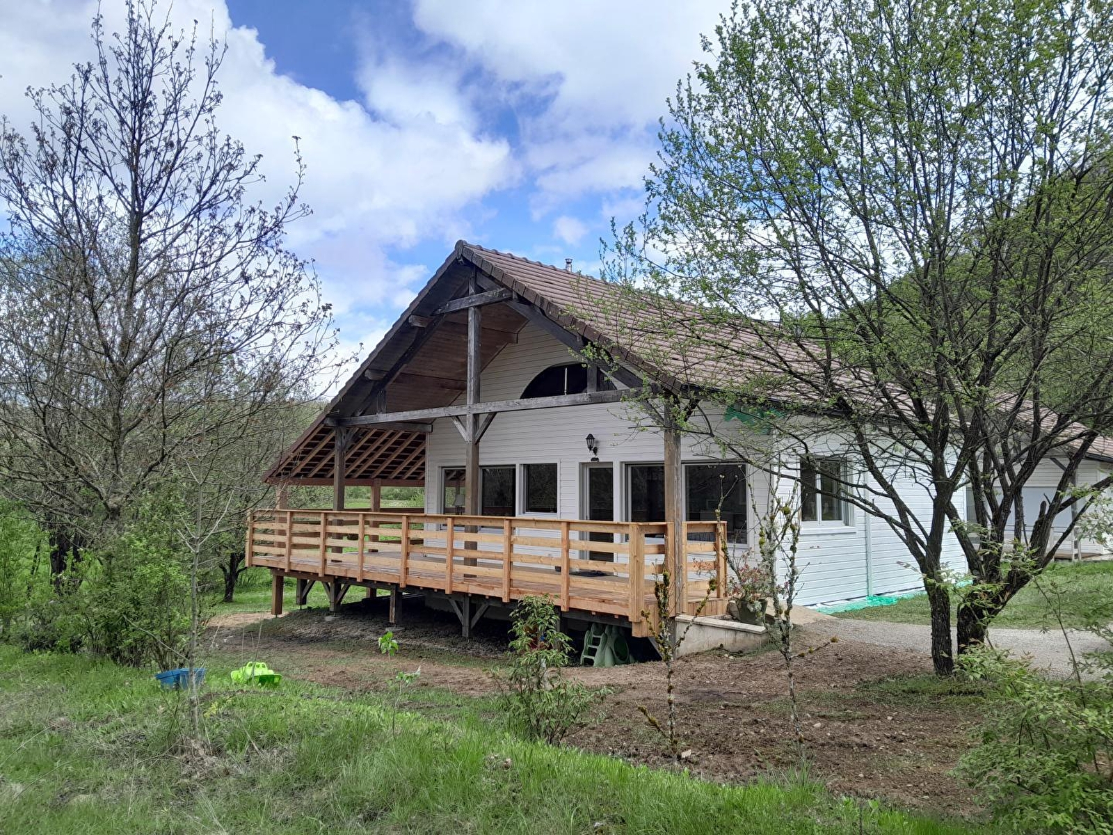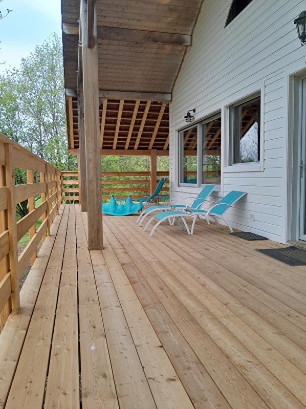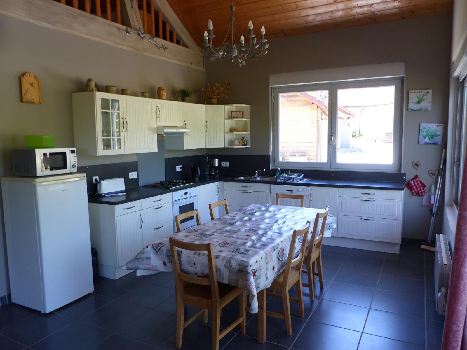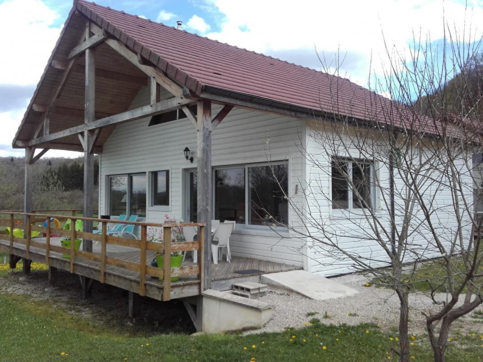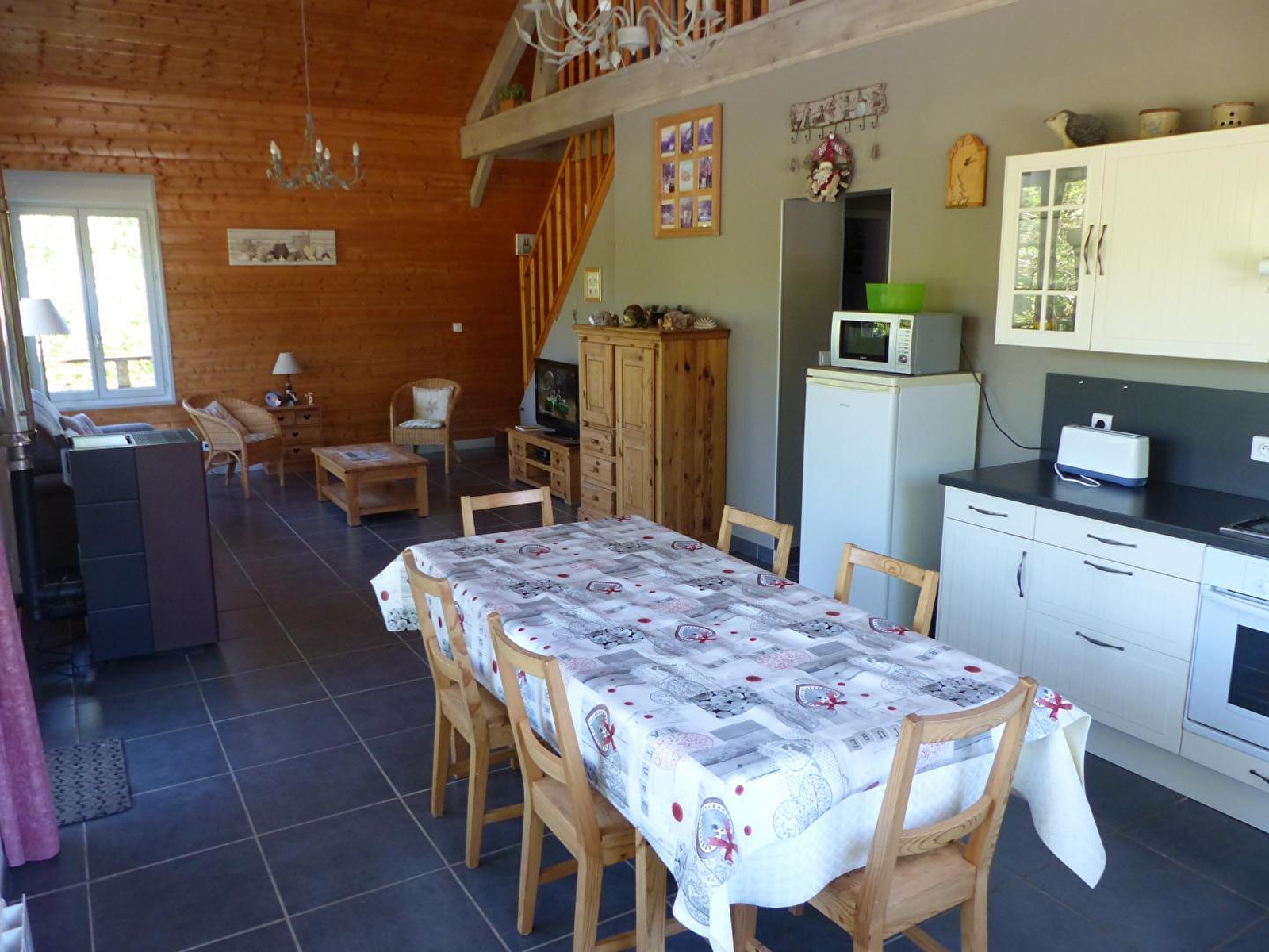 Très beau chalet bois dans un cadre familial et chaleureux à 10 min à pied du Lac de Chalain et à 10 min en voiture des Cascades du Hérisson. Au RDC : cuisine intégrée équipée ouvert sur un beau séjour, lecteur dvd, écran plat avec prise USB, Ch1 : 1 lit 2 pl, Ch2 : 2 lits superposés et un bureau enfant, sdb (douche, WC). A l'étage : une mezzanine avec coin salon détente, Canapé convertible (BZ : 2 pl supplémentaires). Toutes les pièces sont très lumineuses et agréables. Salon de jardin, barbecue, abri voiture. Vue sur la nature environnante. Terrain attenant de 1000m². Location de draps : 9€ avec prestation lits faits à l'arrivée. Note : pour l'électricité un forfait de 8 kwh est offert l'été et 12 kwh l'hiver