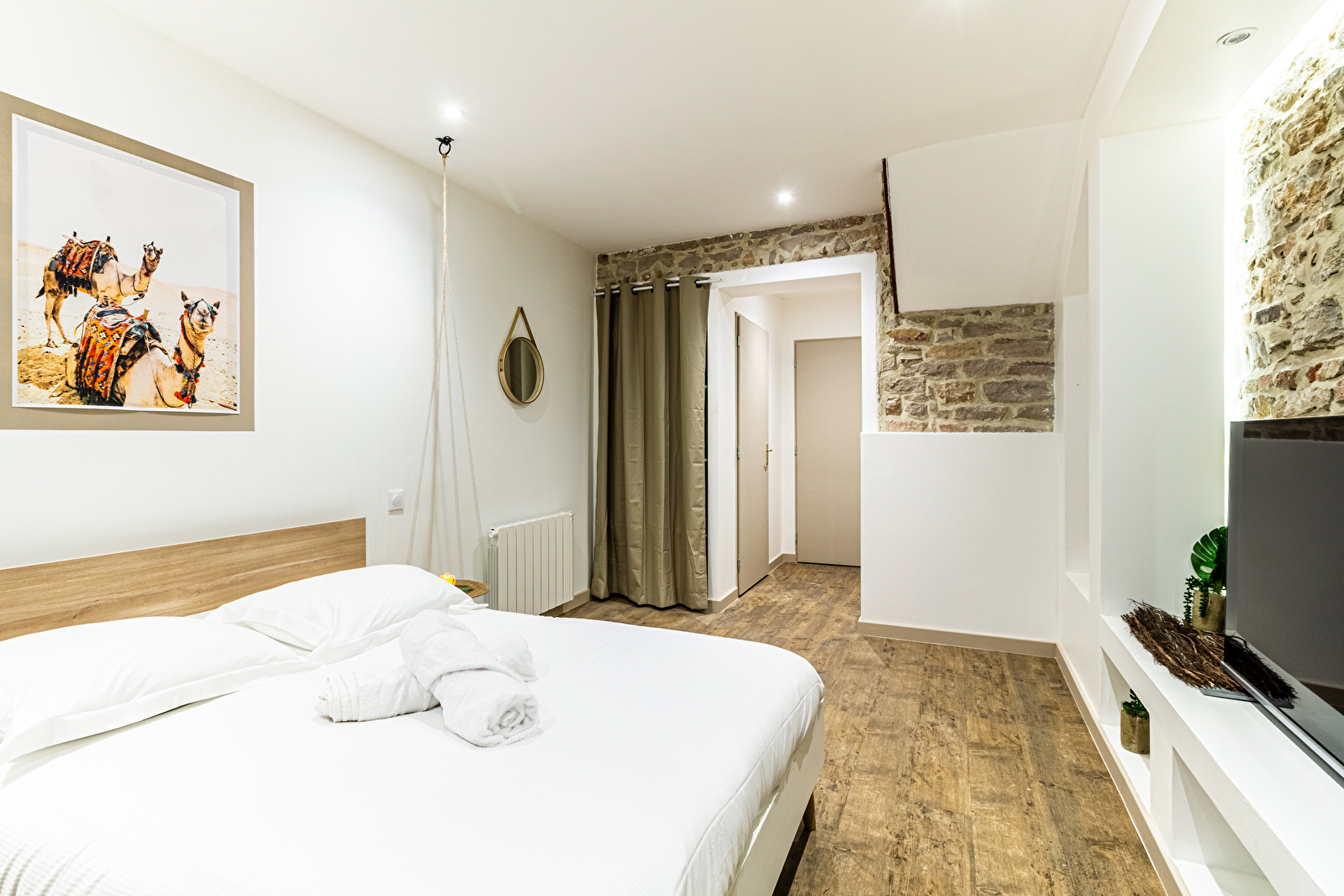 Notre appartement à la décoration inspirée du désert dispose d'une chambre spacieuse avec un lit double confortable, une literie de qualité et une télévision à écran plat. Des touches de décoration évoquant l’univers du chameau et des dunes ajoutent une touche d’évasion à votre séjour.
