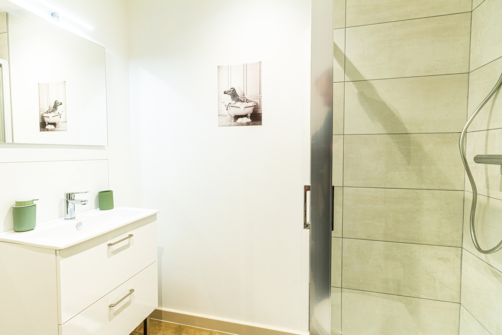 La salle de bains moderne est équipée d’une douche élégante, de serviettes douces et de produits de toilette de qualité.