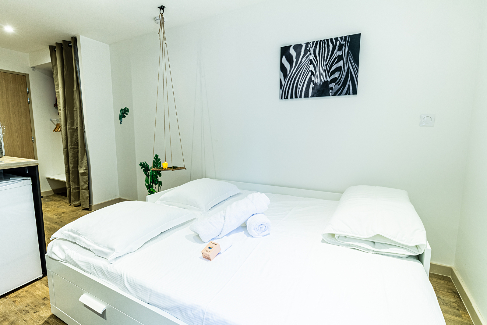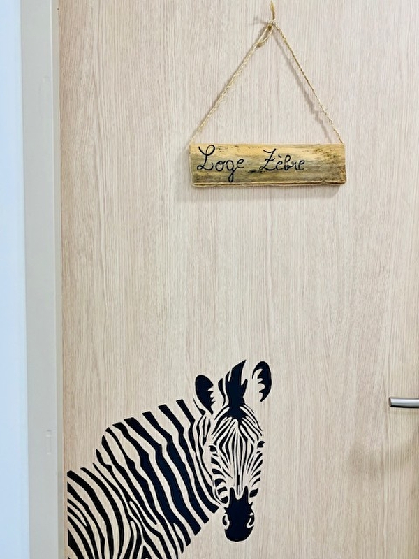 Dès que vous entrez dans la Lodge Zèbre, laissez-vous séduire par une ambiance graphique et apaisante, où les motifs zébrés et les tons naturels évoquent la savane africaine et ses contrastes saisissants.