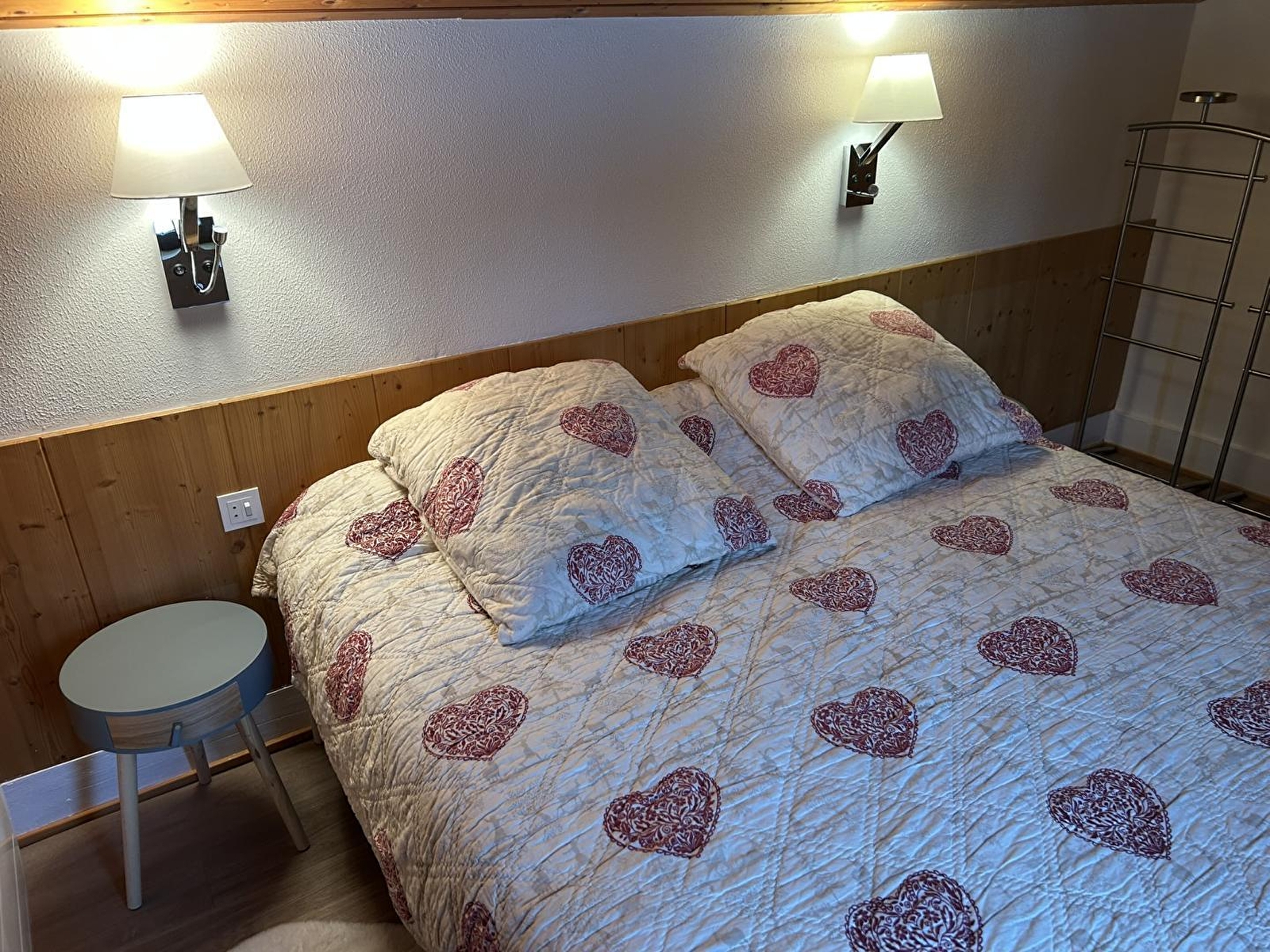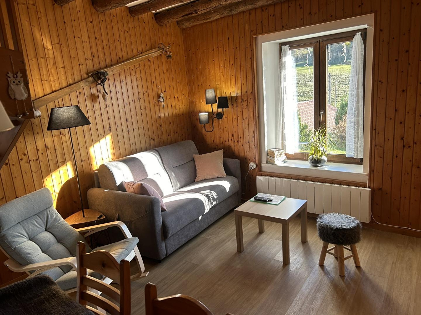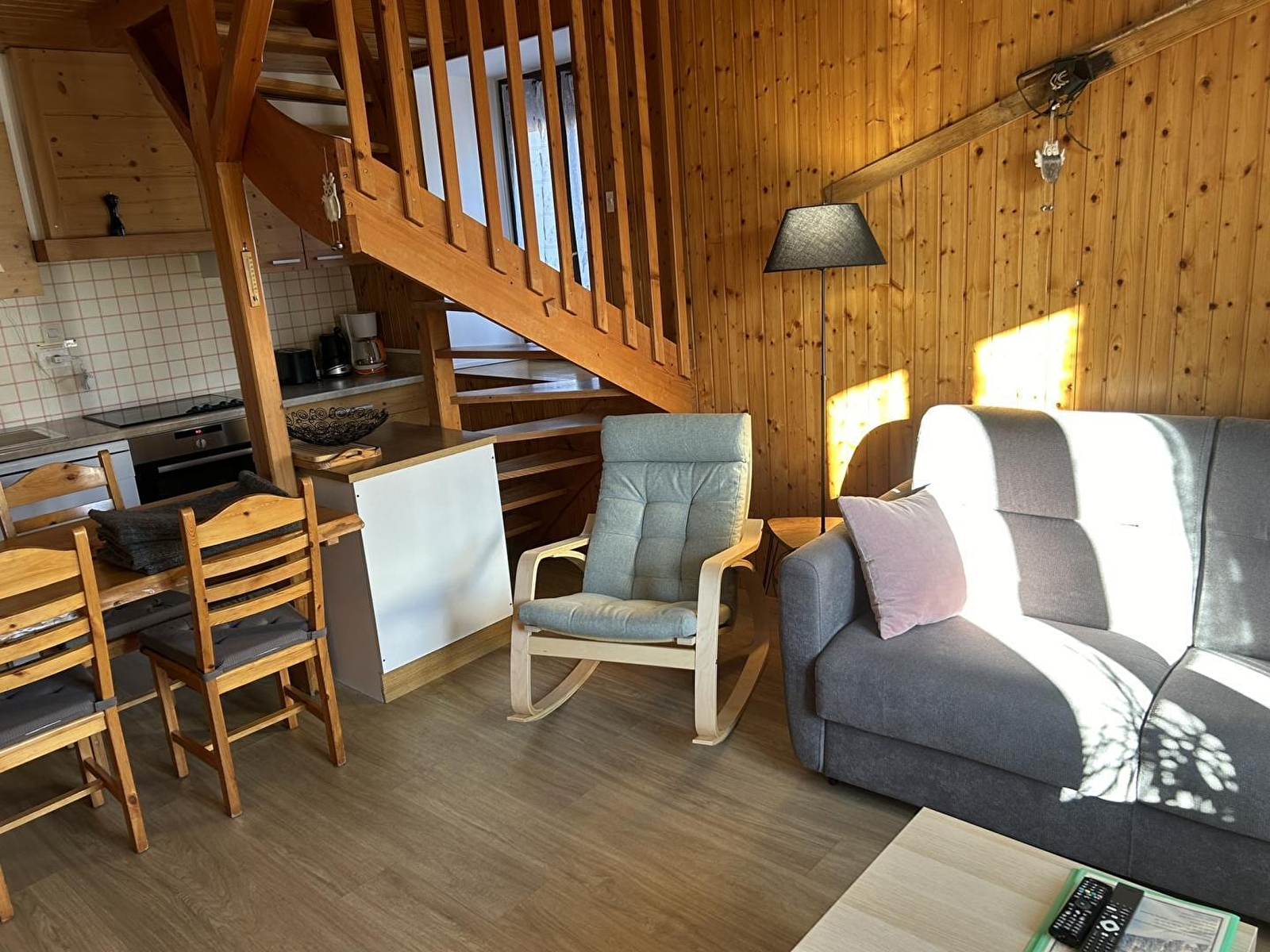 Maison mitoyenne. Au RDC: séjour avec un canapé lit (140), coin-cuisine (avec appareils à raclette et à fondue), salle d'eau, wc indépendants. A l'étage: ch1:1 lit 2 places de 160. Terrasse, terrain attenant non clos en commun avec 2 autres gîtes, salon de jardin, barbecue, parking privé déneigé. Chauffage électrique. Toutes charges comprises en été.