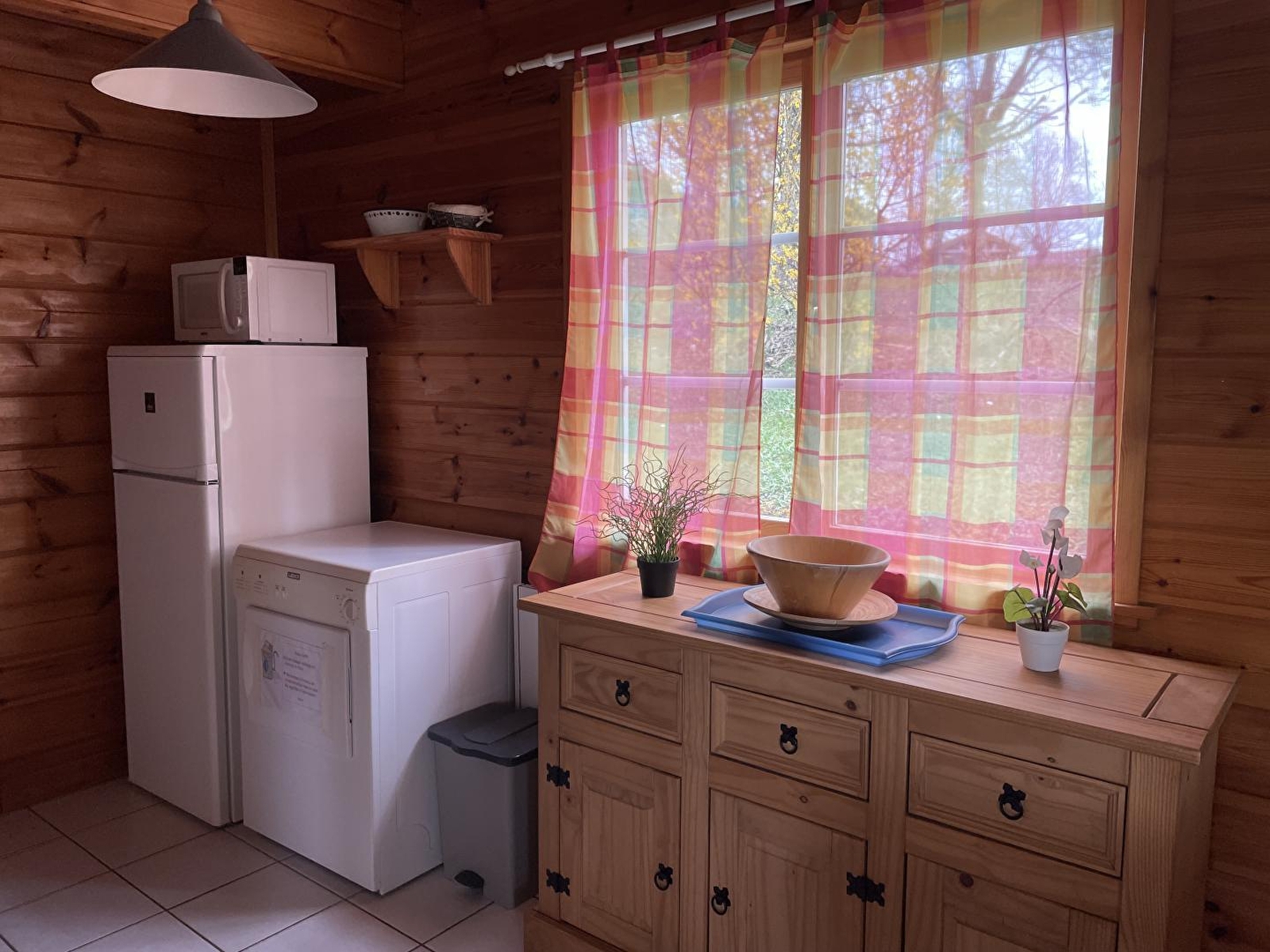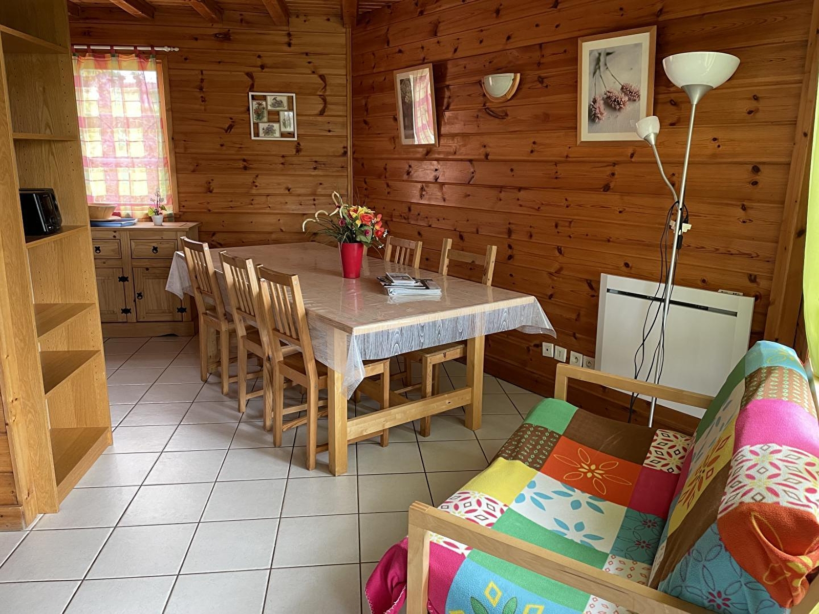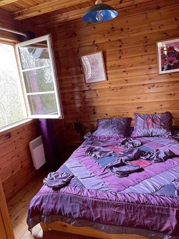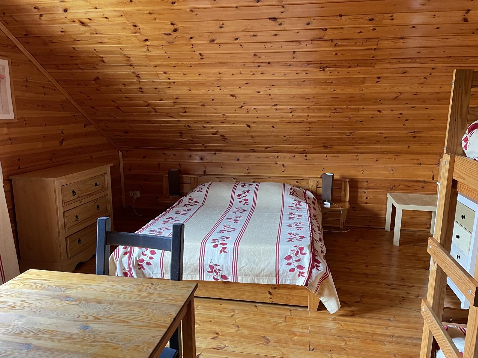 Dans un cadre naturel, chalet bois (SAPIN) entièrement neuf et indépendant, situé sur un terrain comportant 4 autres gîtes. Cuisine intégrée toute équipée (micro-ondes), salon-séjour (poêle à bois) avec de grandes baies vitrées ouvrant sur la terrasse, salle d'eau (douche hydrothérapie et sauna finlandais pour 4 pers), ch1 1 lit 2 pl, buanderie (sèche-linge). A l'étage : salon en mezzanine (canapé-lit 2 pl), ch2 : 1 lit 2 pl + 2 lits 1 pl superposés. Chauffage électrique. Terrain attenant non clos, salon de jardin, barbecue. Prestation ménage à 60 €. Piscine, tennis et terrain de jeux municipal à 100m.