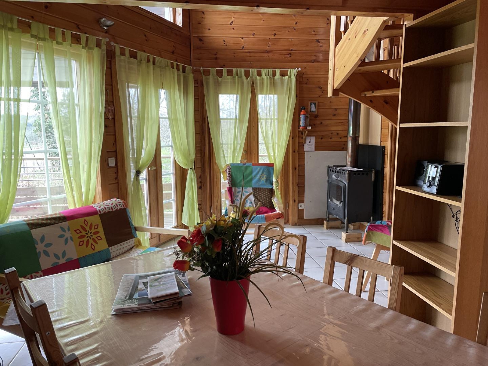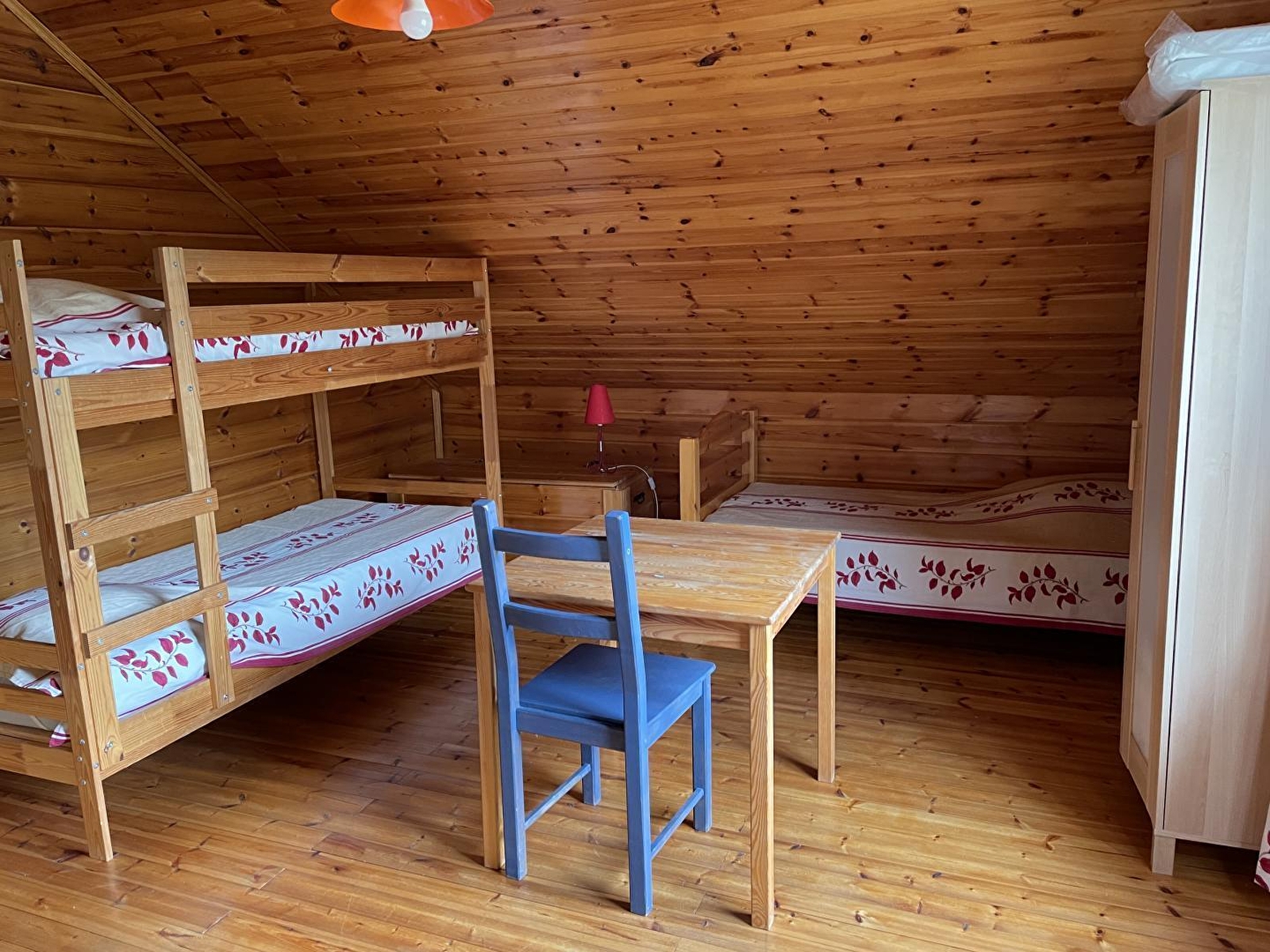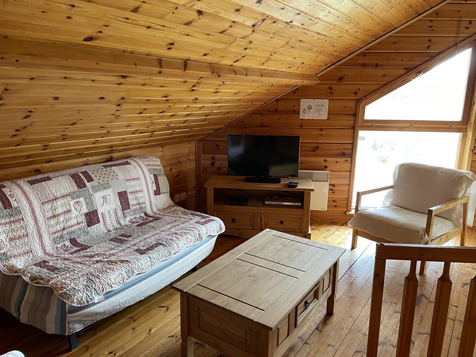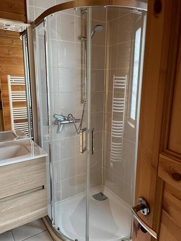 Dans un cadre naturel, chalet bois (SAPIN) entièrement neuf et indépendant, situé sur un terrain comportant 4 autres gîtes. Cuisine intégrée toute équipée (micro-ondes), salon-séjour (poêle à bois) avec de grandes baies vitrées ouvrant sur la terrasse, salle d'eau (douche hydrothérapie et sauna finlandais pour 4 pers), ch1 1 lit 2 pl, buanderie (sèche-linge). A l'étage : salon en mezzanine (canapé-lit 2 pl), ch2 : 1 lit 2 pl + 2 lits 1 pl superposés. Chauffage électrique. Terrain attenant non clos, salon de jardin, barbecue. Prestation ménage à 60 €. Piscine, tennis et terrain de jeux municipal à 100m.