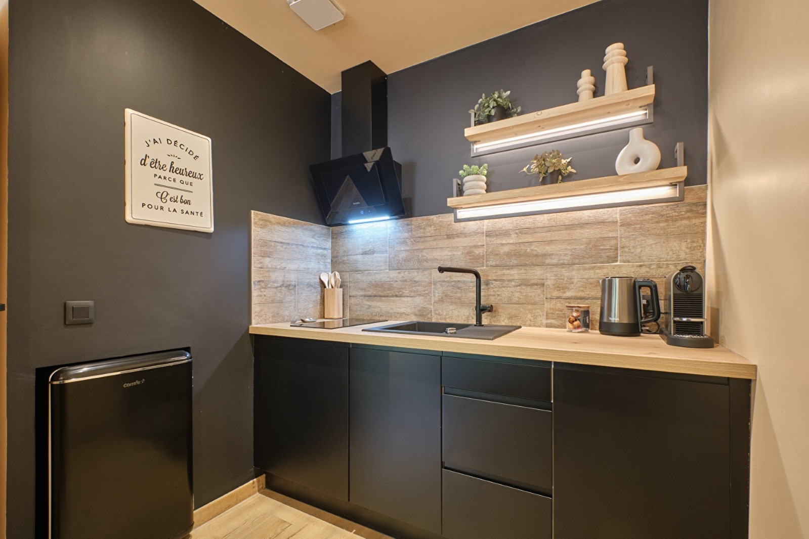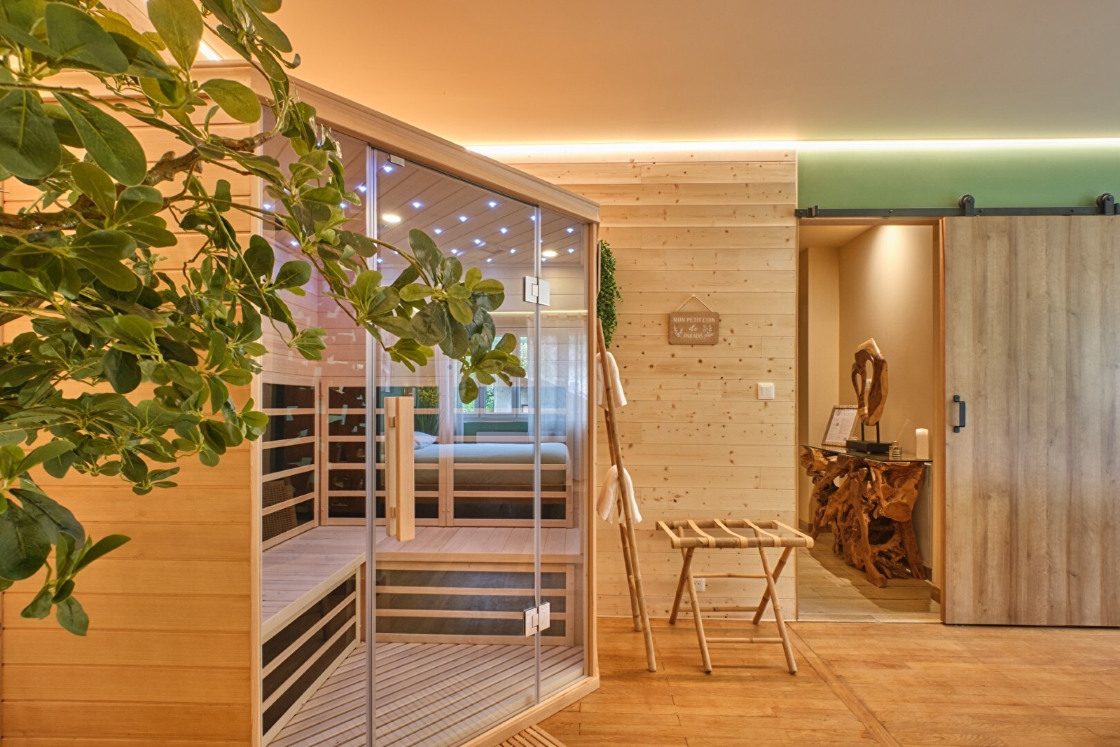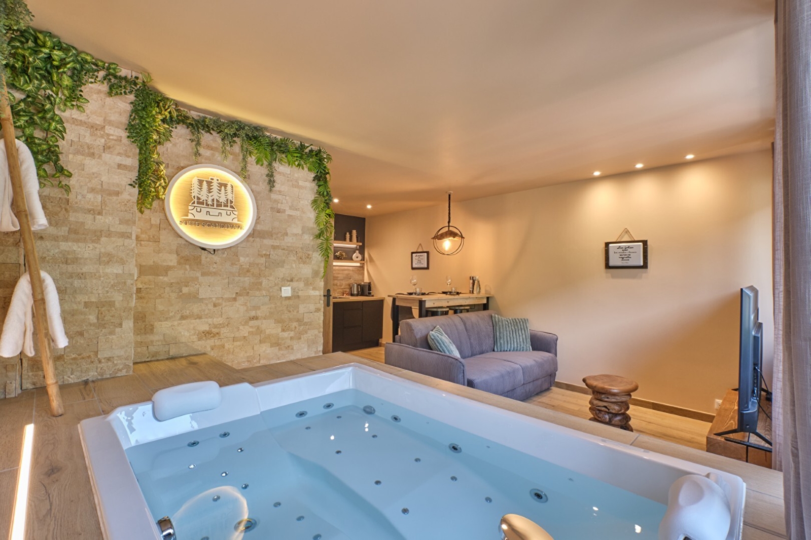 Profitez d'un espace bien-être rare, équipé d'une baignoire balnéothérapie profil anatomique exclusif et d'un grand sauna, pour des moments de détente inoubliables. L'appartement dispose également d'un confortable salon avec une télévision connectée à Netflix, ainsi qu'une petite cuisine entièrement équipée, vous permettant de savourer des repas faits maison et de profiter d'une autonomie totale durant votre séjour.