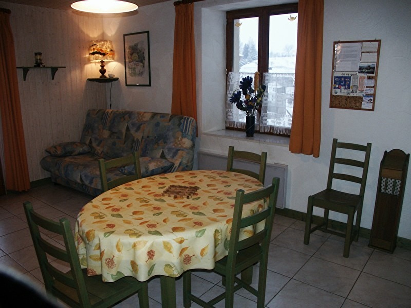 Logement dans une maison mitoyenne située au coeur du Parc Naturel Régional du Haut Jura, au pied des pistes de ski de fond, sur le domaine skiable de Longchaumois. Au RDC: cuisine-séjour (four traditionnel), canapé convertible, WC indépendant. A l'étage: salle d'eau avec WC, ch1: 1 lit 2 pl, ch2: 2 lits 1 pl superposés, lit bébé à disposition, terrain attenant non clos, salon de jardin, barbecue. Chauffage électrique. Charges non comprises. Les draps sont fournis et les lits faits à l'arrivée. Parking privé sur place et volets dans les chambres.