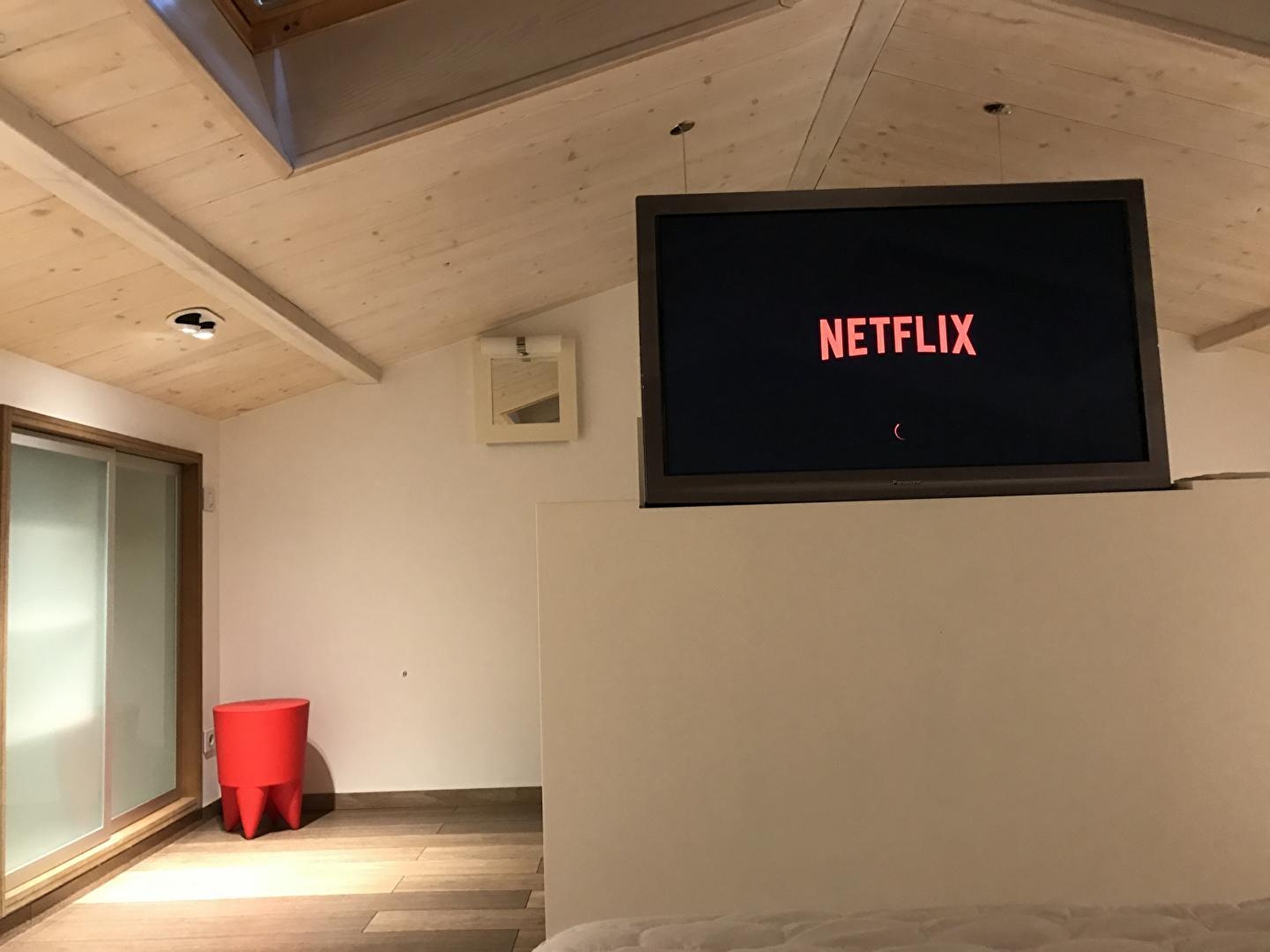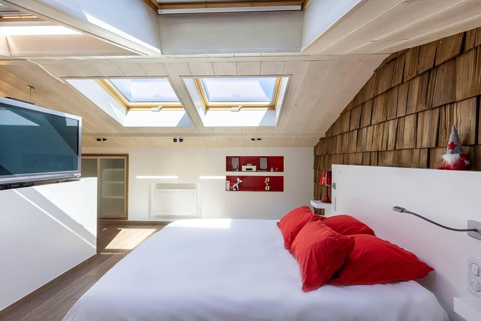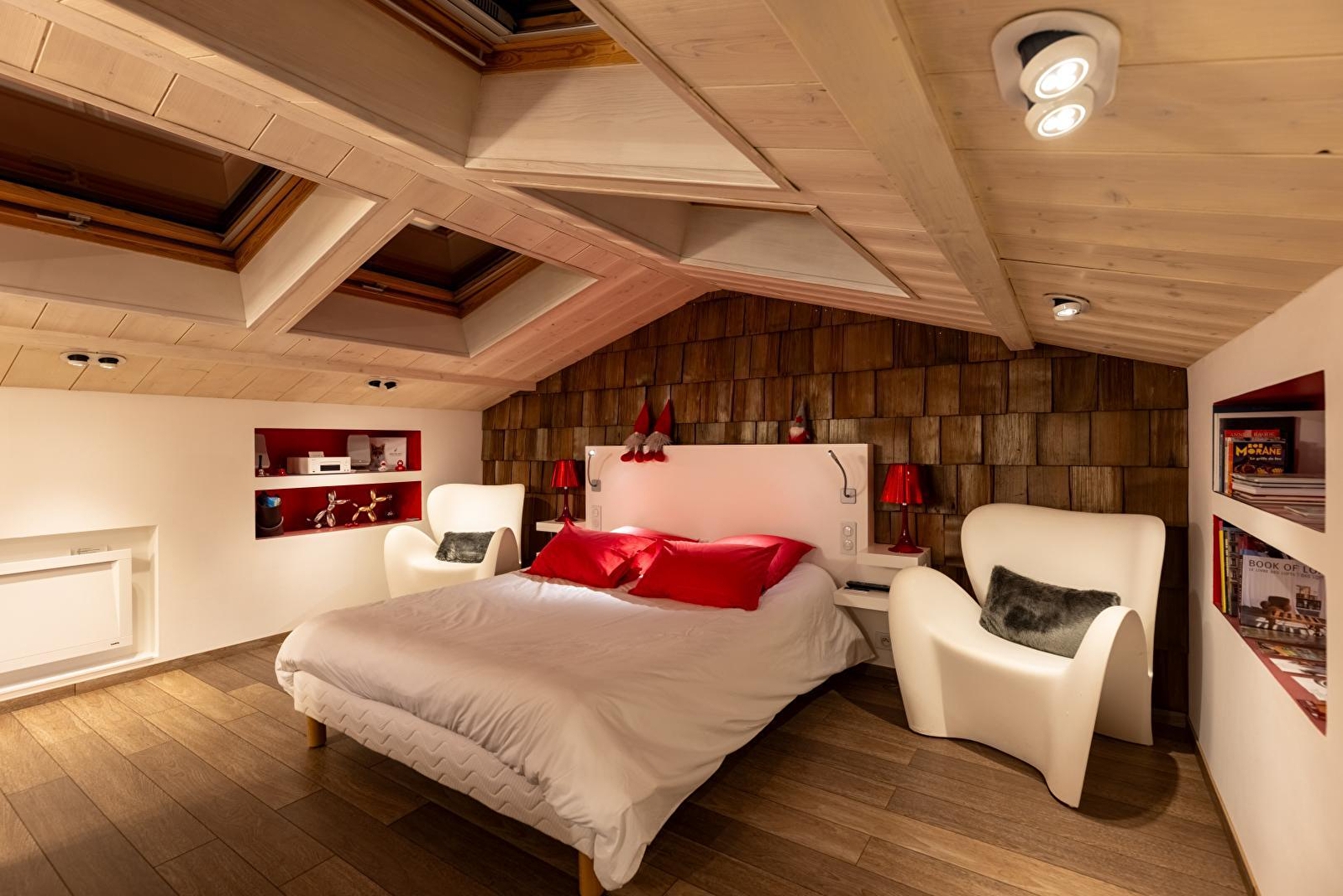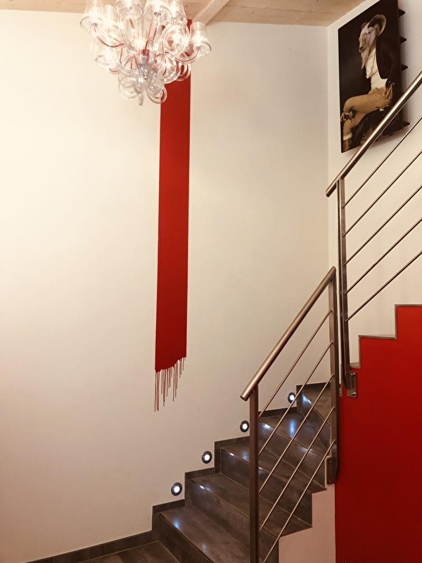 Poussez la porte de Vanadium et découvrez d'abord, au rez-de-chaussée, la cuisine équipée de plaques à induction et micro onde Siemens. Le rouge crée un contraste marqué immédiat et donne le ton. Ce lieu vous tapera dans l'oeil et son originalité ne vous échappera pas. Dans les niches se logent cafetière Nespresso, bouilloire Alessi, enceinte Denon et autre petit objet design, souvent de rouge vêtus. A l'instar du réfrigérateur Smeg qui rafraîchira vos soirées. Depuis la cuisine, accédez à la terrasse pour un moment de sérénité bercé par le chant des oiseaux (et quelques hennissements). A l'étage du gîte, un lit haut de gamme de 160x200 cm vous attend dans la chambre, baignée dans une lumière naturelle grâce à de belles ouvertures dans le toit. En période hivernale, une couette «Everet» et du linge de lit Carré Blanc vous réchaufferont. La chambre est tout confort: double vasque au bout du lit, grande douche à l'italienne. Cliquez sur un bouton, et une TV apparait comme par magie: un écran HD 55 pouces avec accès à Apple TV, Netflix, Canal+. Vanadium est joliment décoré de luminaires Fat boy et d'objets design