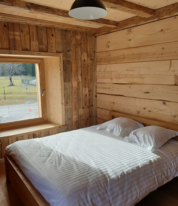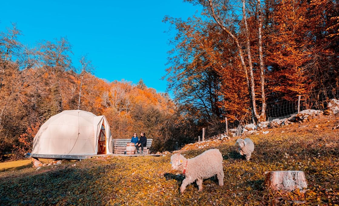 Moutons, poules, chèvres... et jolis chalets (ou emplacements pour les adeptes de van, camping-car et tente) se partagent deux hectares de verdure en bordure de rivière. Le tout encadré par les plus haut sommets des Montagnes du Jura...