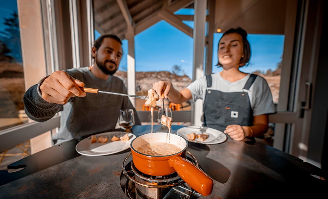 Ici, la convivialité n’a pas besoin d’être inscrite à l’ardoise. Quant au menu, il convoque des spécialités du terroir et des vins de la région ; une cuisine traditionnelle montagnarde donnant envie de faire durer l’instant le plus longtemps possible autour du caquelon. Après tout, l’après-midi ne fait que commencer…