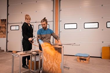 Fixés à Valserhône après avoir sillonné la planète, ils exercent leur délicat métier de plasticiens verriers dans une ancienne école. A l'atelier de verre Anvi, ils transmutent la pâte incandescente et la métamorphosent en vaisselle usuelle (verres, carafes à décanter…), en sculptures (leurs splendides sacs), en bijoux…