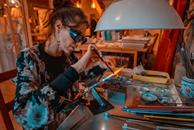 Artisanat d’art, du feu et de la matière, le filage du verre tient à la fois de l’alchimie et de la sculpture, sans oublier cette pincée de fantaisie magique nécessaire à toute entreprise créative. Le résultat ? Des bijoux à nul autre pareils ; des perles chatoyantes évoquant des pierres fines polies, des pendentifs aux élégantes inclusions…
