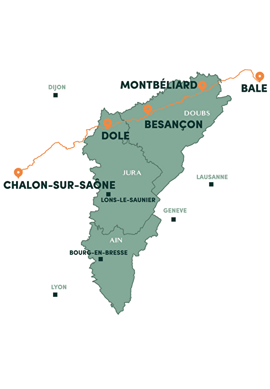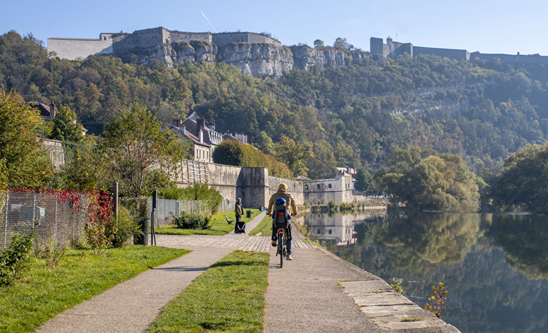 L'itinéraire se prolonge en pente douce le long du paisible canal du Rhône au Rhin jusqu’à la vallée du Doubs. La tortueuse rivière serpente entre collines boisées et barres rocheuses. On y croise sur la route, Baume-les-Dames, puis Besançon dominée par sa majestueuse Citadelle de Vauban classée à l’Unesco, avant d’atteindre celle qui nous fait craquer avec ses petits airs de Venise : Dole, dernière étape de charme avant de quitter la rivière du Doubs pour la Saône.