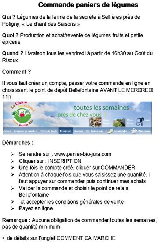 - Paniers de légumes à venir chercher les vendredis après midi, en provenance de la ferme de la Secrète à Sellières.