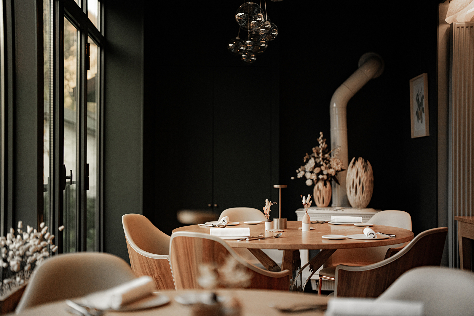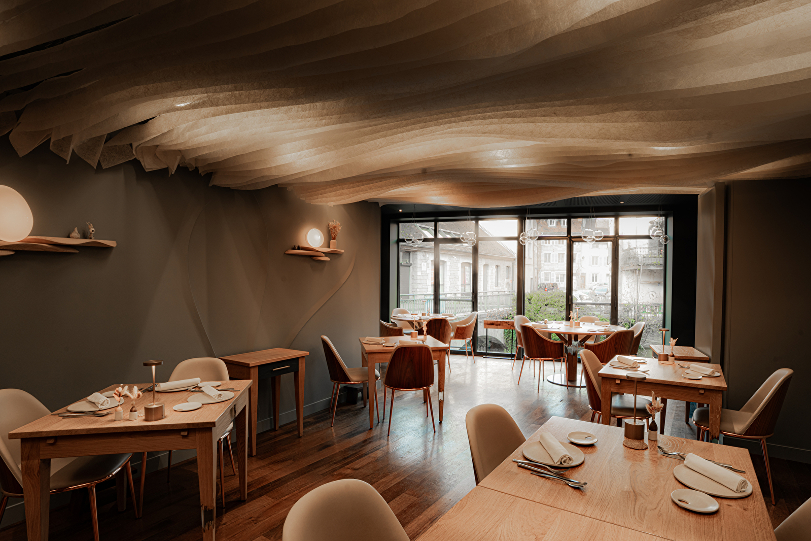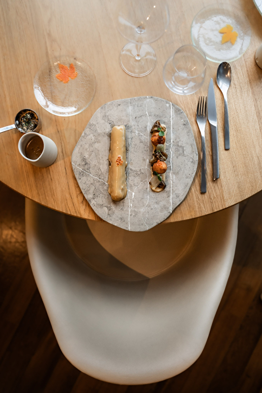 Ici, tout est pensé pour que l’on se sente bien : le bois qui enveloppe la salle, la lumière douce, la rivière toute proche, la vaisselle façonnée à la main, les couteaux taillés dans la pierre, le silence des cuisines d’où naît une cuisine pleine de vie.