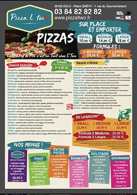 Pizza L’Two vous propose chaque jour une large sélection de délicieuses de pizzas, salades, tex- mex ,
