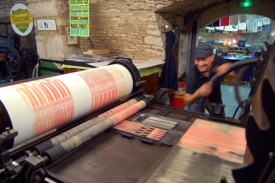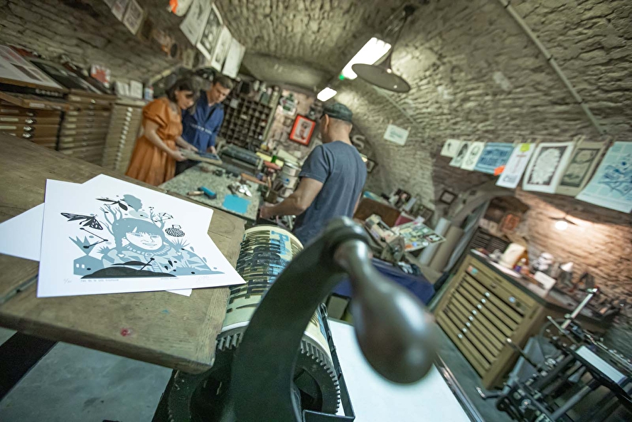 Au cours de la visite du coeur historique, un arrêt s’impose à l’atelier Affiche Moilkan, imprimerie artisanale qui utilise les techniques de typographie et de linogravure. Comme son nom l’indique, l’atelier Affiche Moilkan crée… des affiches et affectionne les jeux de mots.