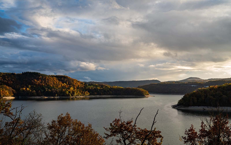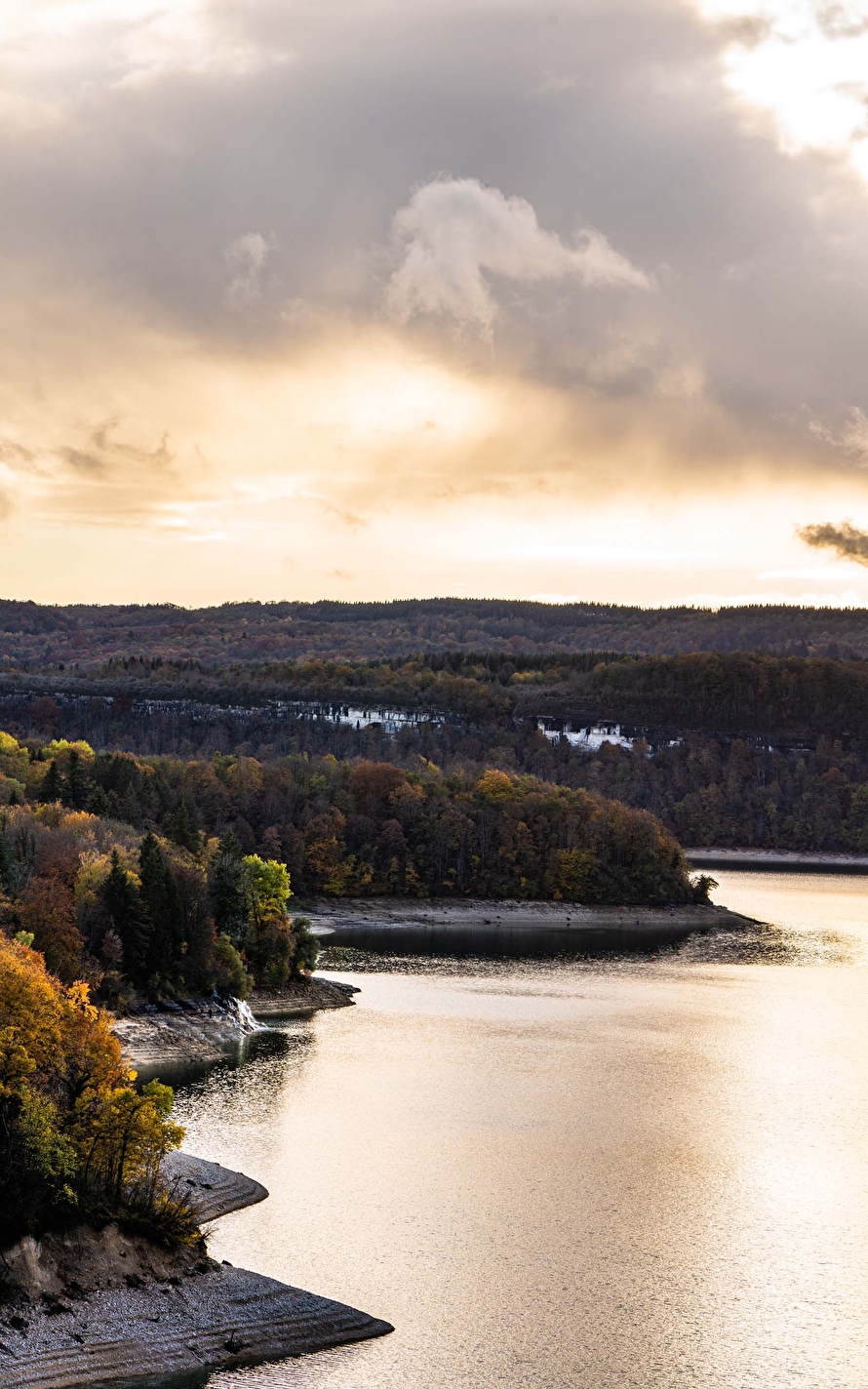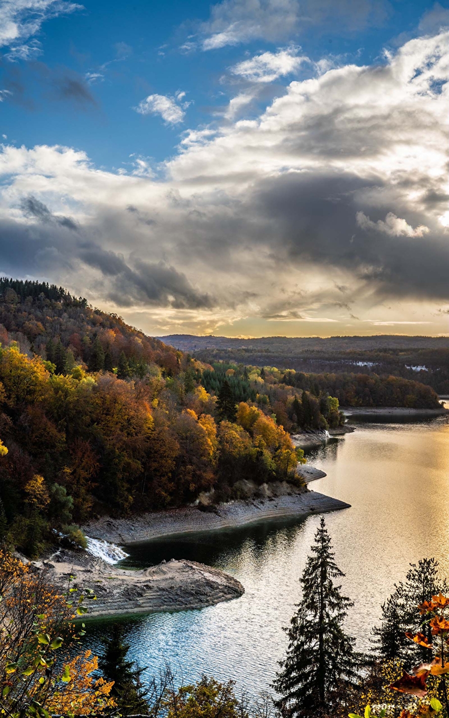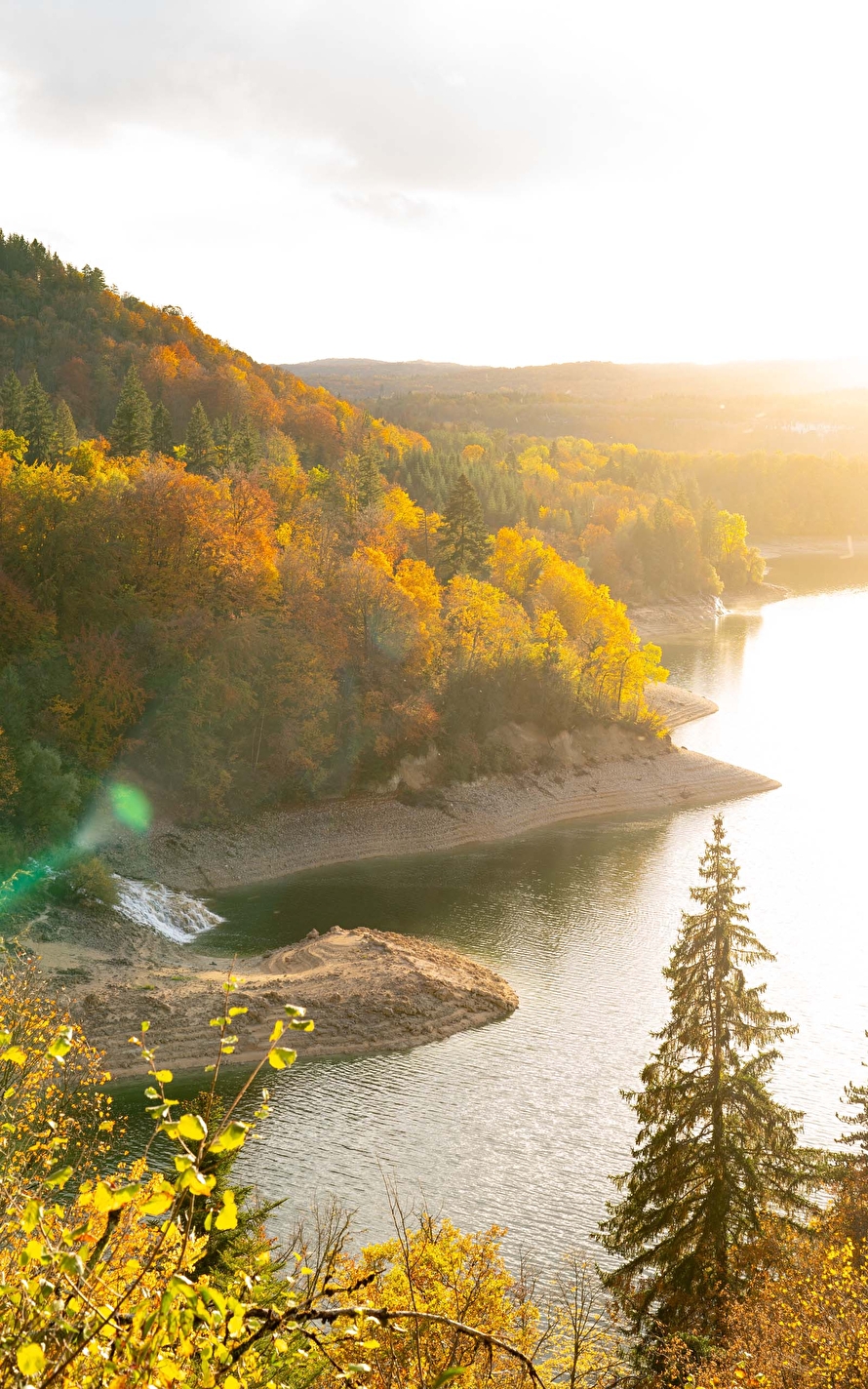 La vue en hauteur sur l'immense lac Vouglans cerné de forêts aux couleurs chaudes d'automne est tout simplement magique !