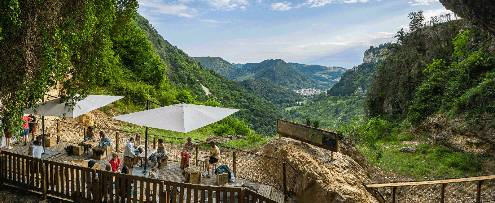 Après la traversée d'une salle majestueuse, quelques efforts suffiront pour déboucher sur un surprenant belvédère en milieu de falaise face à la reculée de Cerdon... à ne pas manquer... tout comme ce porche unique franchi en fin de visite pour entrer dans la Préhistoire.