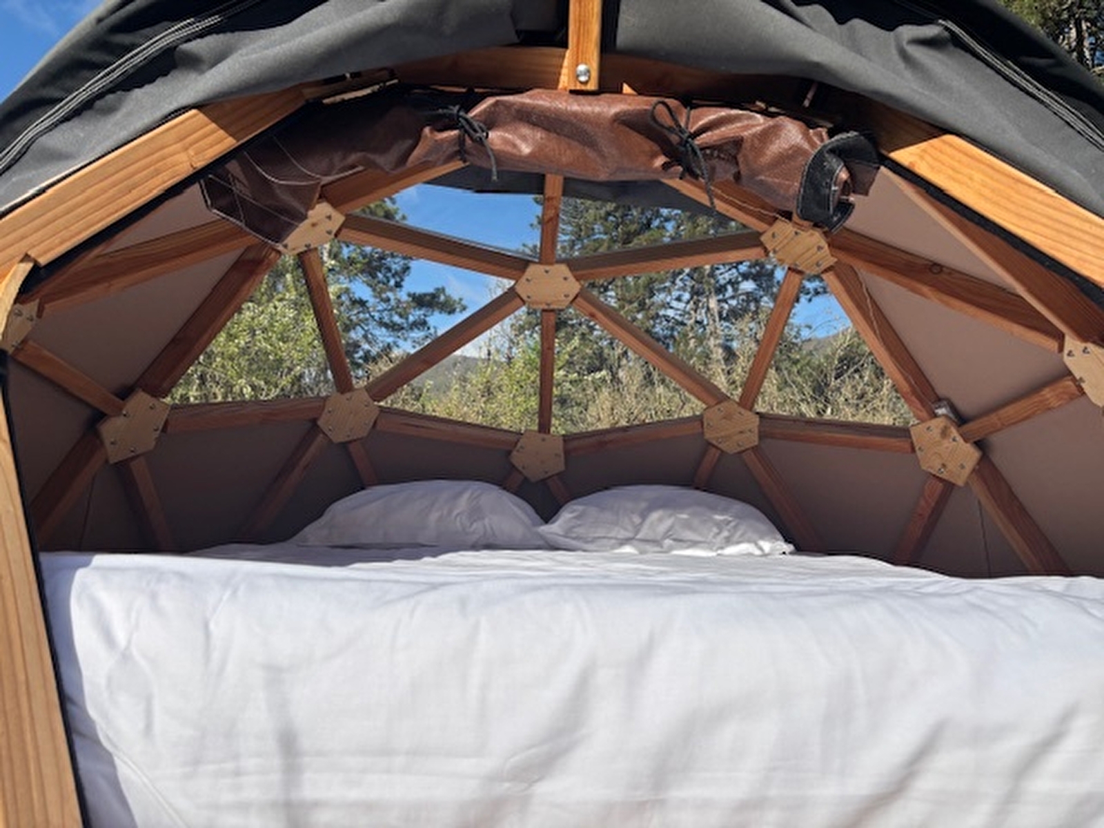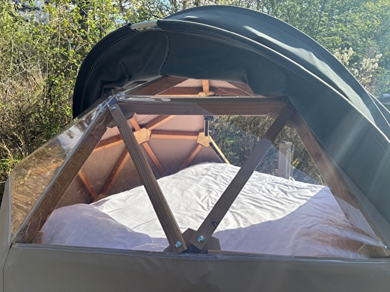 L’atout du dodôme étoilé : une occultation amovible. Une tente transparente avec un confort thermique en journée, et occulte la lumière pour ceux qui ne souhaitent pas être réveiller aux aurores. Elle se manipule manuellement depuis l’extérieur.