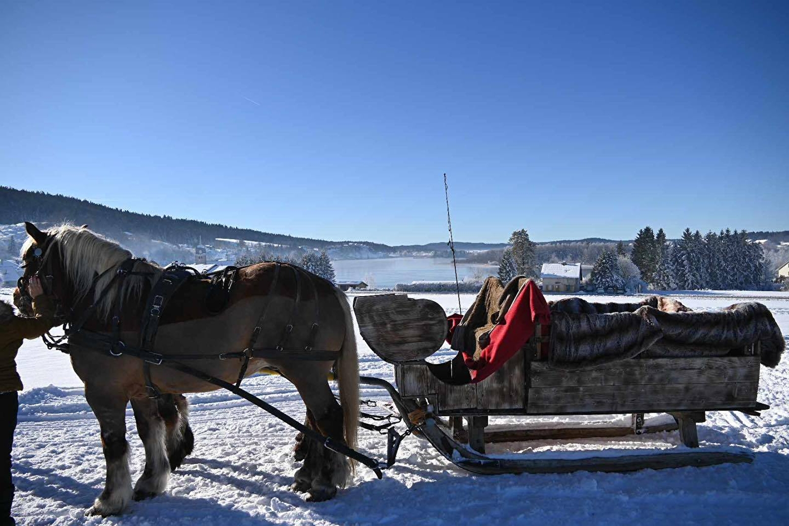 Pendant les périodes enneigées, Nicolas peut proposer un circuit en traineau à proximité des bois du Grandvaux.