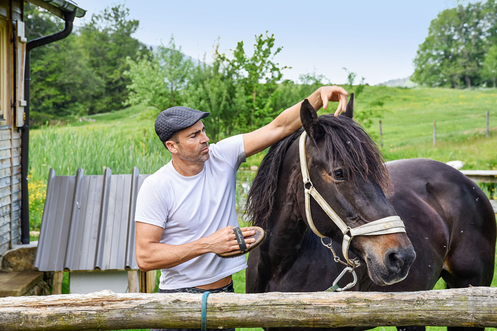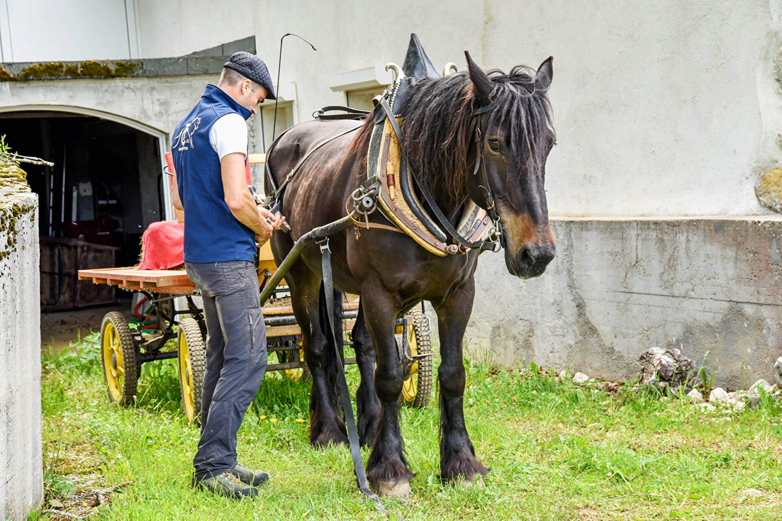 Après 15 minutes de préparation, vous vous familiarisez avec le cheval de trait qui vous emmène en balade.