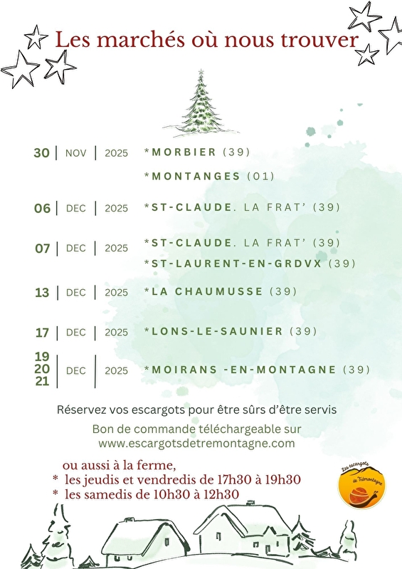 Au menu : Coquilles à la Bourguignonne, Croustilles au comté, à la Bourguignonne ou à la Provençale, escargots au court bouillon, Escargotines provençales et bourguignonne.