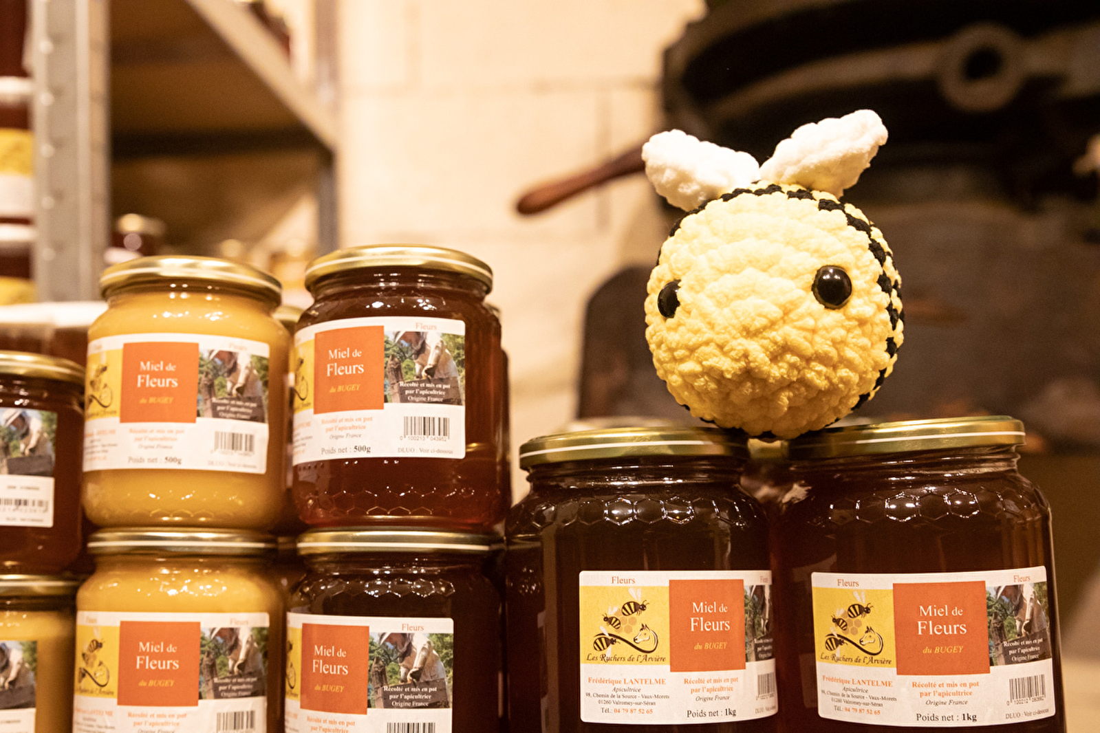 Frédérique produit du Miel du Bugey de différents parfums, ainsi que des produits dérivés (bonbons, pollen, pains d'épices, guimauve, noisettes au miel, nougats, bougie ...)